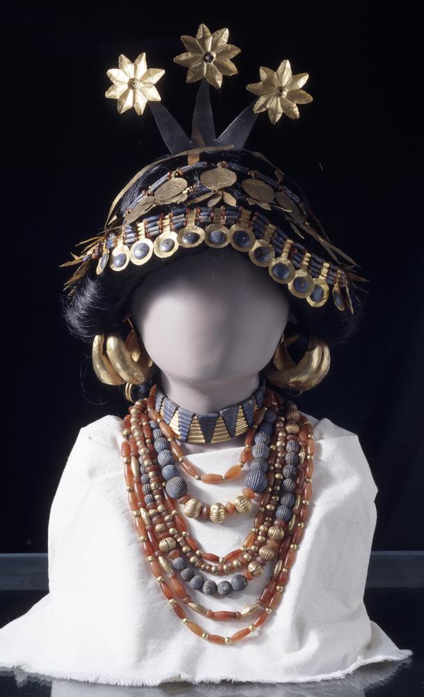 왕비의 장신구는 금과 청색 돌로 화려하게 장식되어 있다. 이 중 청색 돌인 라피스 아줄리는 우르에서 2천 킬로미터 떨어진 아프가니스탄에서만 생산되는 것으로 이 돌을 장신구에 사용했다는 것은 당시 우르가 먼 아프가니스탄과 교역을 할 정도로 강력한 왕권 국가였다는 것을 보여준다.