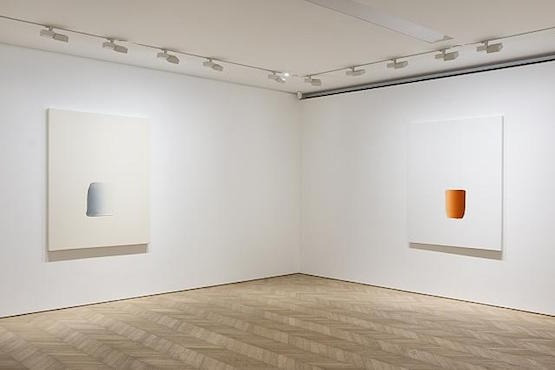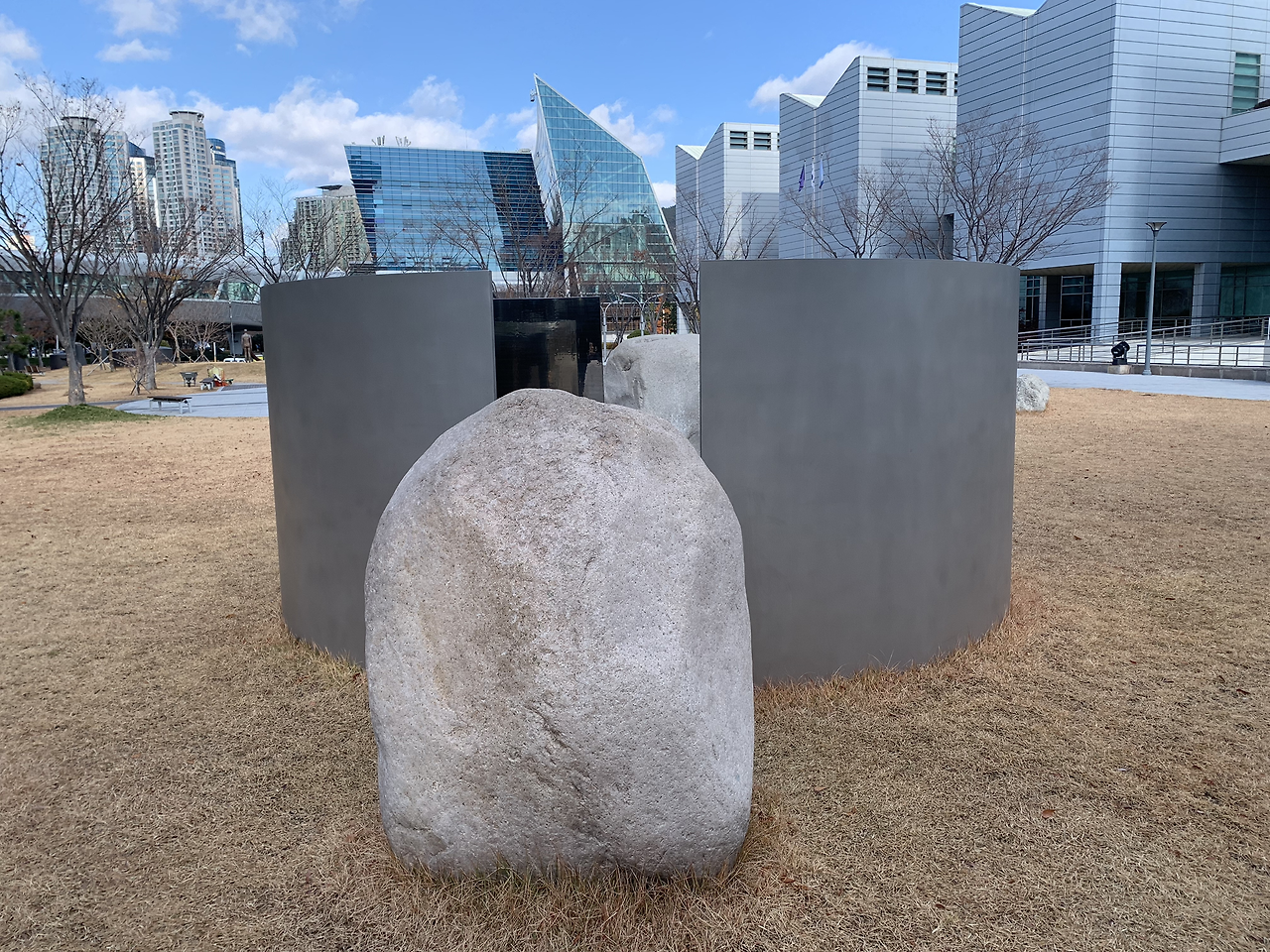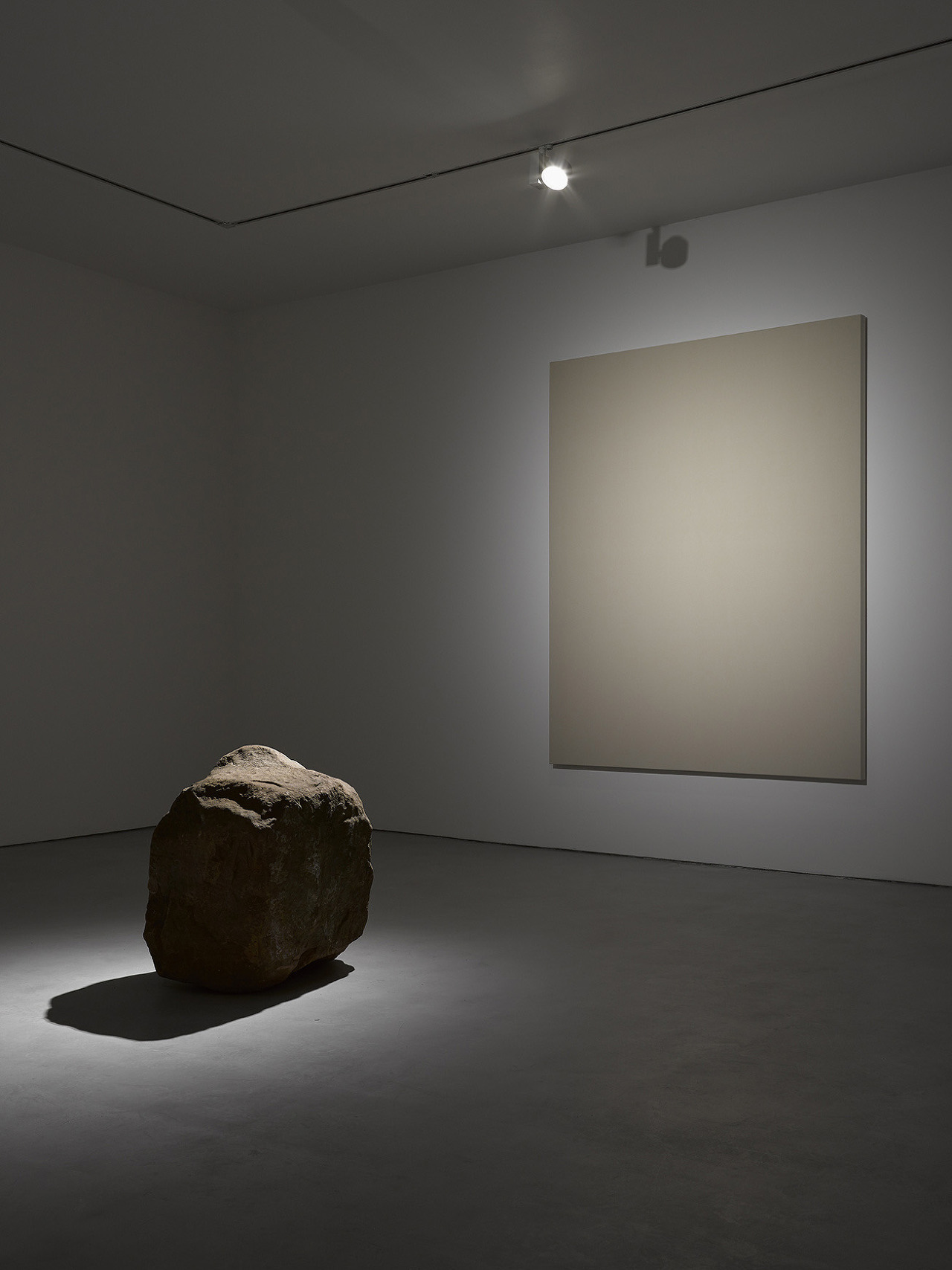 마지막 전시실로 다가가 전시실 입구의 커튼을 젖히고 안으로 들어서면 하얀 벽면 앞에 바위가 놓여있다.
