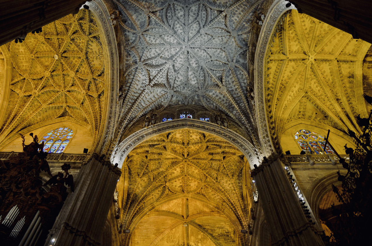 64개의 첨두아치와 60개의 기둥이 바치고 있는 세비야 대성당의 천장은 마감 처리하지 않고 육체적인 뼈대를 그대로 드러내어 창으로 들어오는 영적인 빛과 어우러져 최절정의 미를 보여준다.