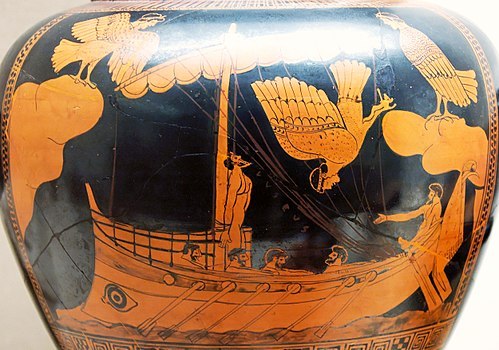 <오디세우스의 귀환> 코너에 있는 적회식 항아리에는 오디세우스가 사이렌의 유혹을 받지 않으려고 자신을 돛대에 묶은 채 사이렌의 노래를 듣고 있다. 사이렌은 바다의 요정으로 여성의 머리에 물새의 몸을 가진 모습이다. 흑회식에 비해 새의 깃털 묘사가 훨씬 자연스럽게 묘사되어 있다.
