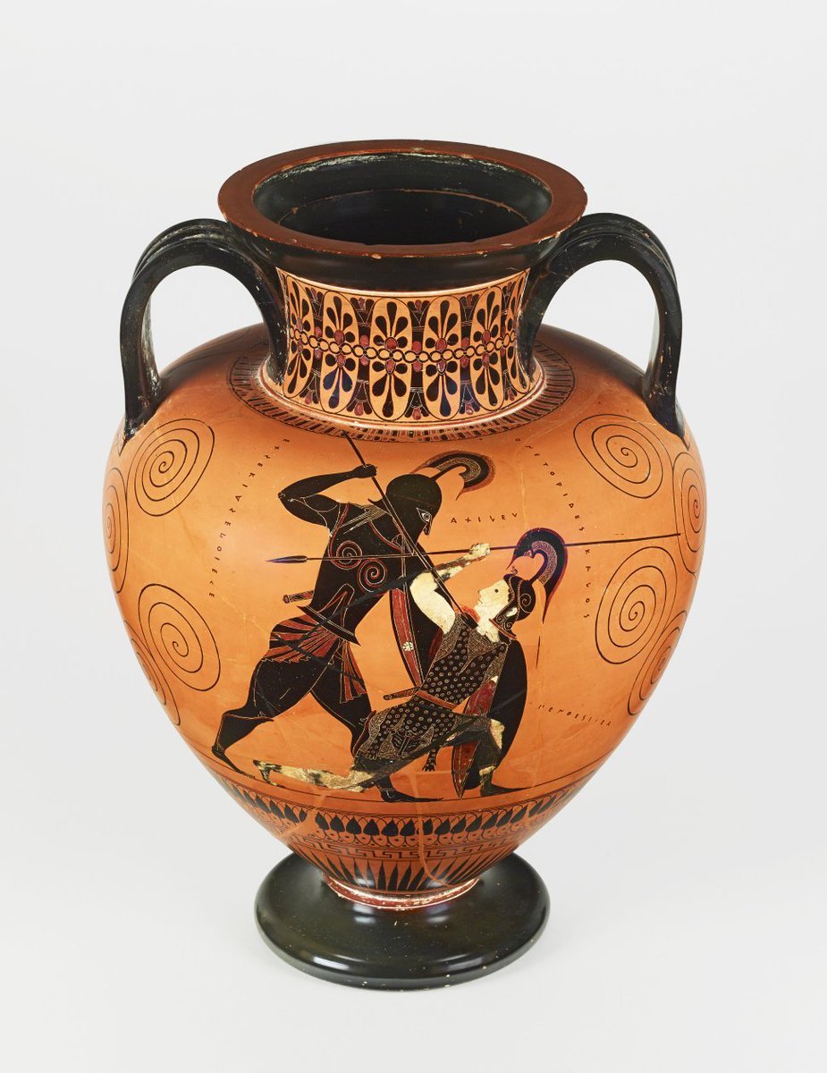 <트로이의 전쟁> 코너에 있는 흑회식 항아리에는 트로이 전쟁 중 아마존의 여왕 펜테실레이아를 죽이는 아킬레우스의 모습을 담은 모습이 그려져 있다. 여기서 아마존은 남미에 위치한 강의 이름이 아니라 현재 터키 인근에 위치한 국가를 말한다. 아마존의 여왕 펜테실레이아는 트로이 전쟁에 나가 수많은 그리스 군을 무찌른 전쟁 영웅이다. 그녀는 결국 아킬레스와 대적하였으나 그가 던진 창에 찔려 전사하였다.