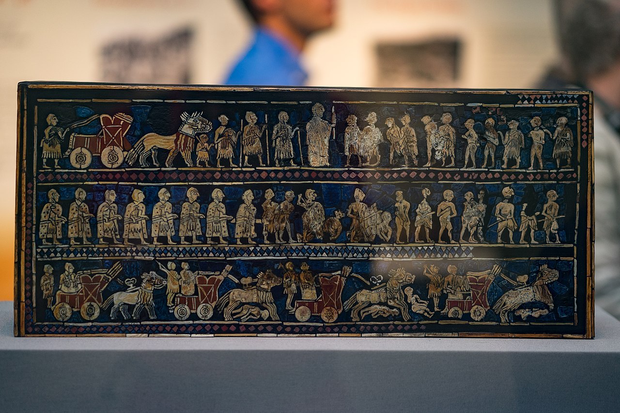 우르의 스탠더드 뒷면은 전쟁 장면으로 가장 아래단에는 네 마리의 조랑말이 전차를 이끌며 적을 무찌르고 있다.
