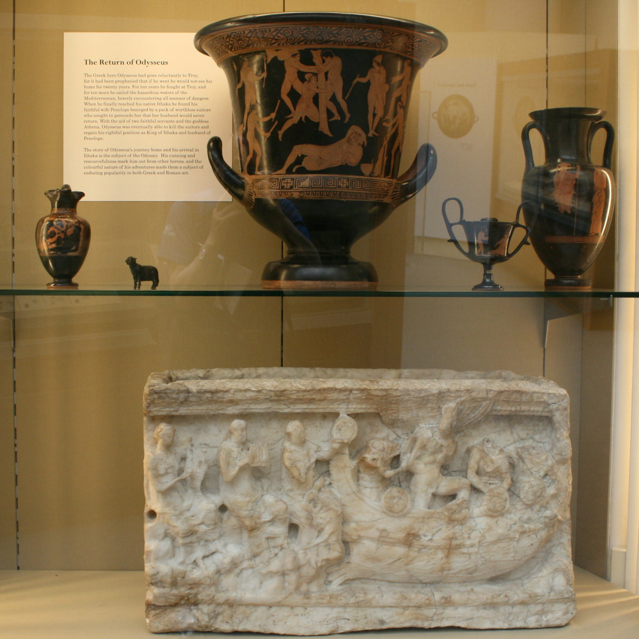 <오디세우스의 귀환>이라는 코너에 있는 석고에는 오디세우스가 사이렌의 유혹을 받지 않으려고 자신을 돛대에 묶은 채 사이렌의 노래를 듣고 있는 장면이 새겨져 있고 항아리에는 외눈박이 거인 폴리페모스를 속이는 장면이 새겨져 있다.