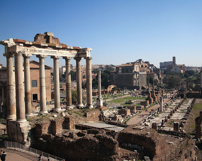 원로원 옆으로 기둥들이 늘어서 있는 곳이 기원전 179년 마케도니아를 제압한 집정관 에밀리아가 세운 <바실리카 에밀리아>로 많은 정치인과 사업가가 교류하는 시장으로 사용되었다.