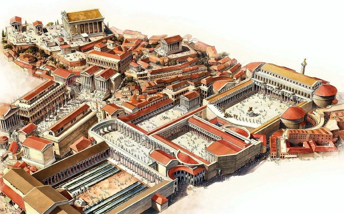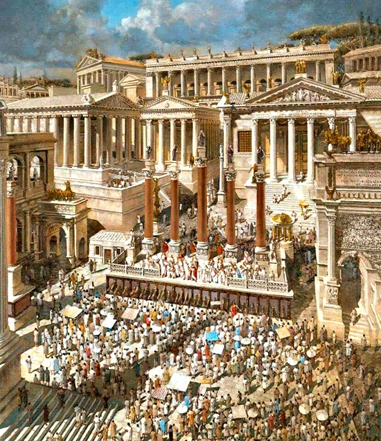 연설 단 뒤로 기원전 80년에 술라가 지은 국립 도서관인 <타불라리움>이 있고 도서관 앞에 보이는 개선문을 지나면 삼각 지붕을 한 원로원이 있다.