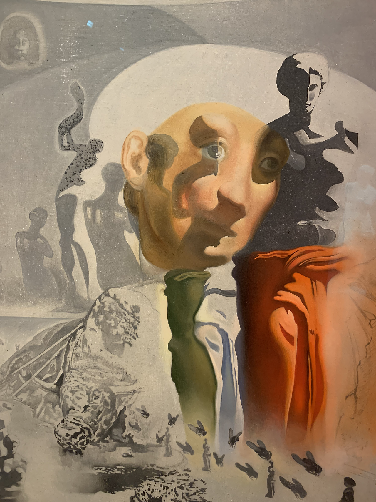 그의 어깨뒤로 영원함과 죽음을 상징하는 사이프러스 나무와 카탈루냐 지방의 적막한 절벽들이 보이고 자화상 밑으로 유아적 자기 이미지와 구멍에서 버려진 잔해들이 그를 더욱 외롭고 슬프게 만들고 있다.