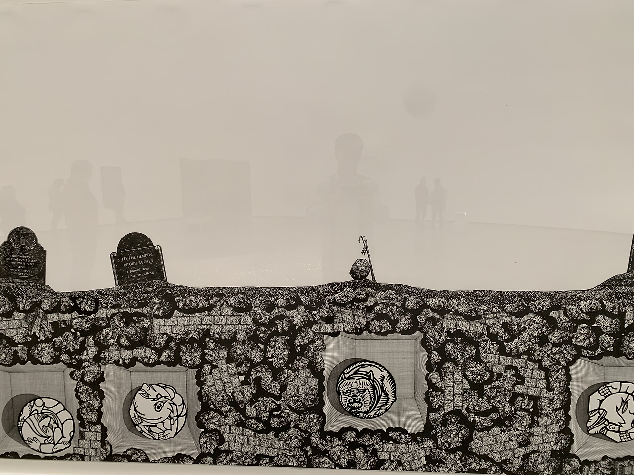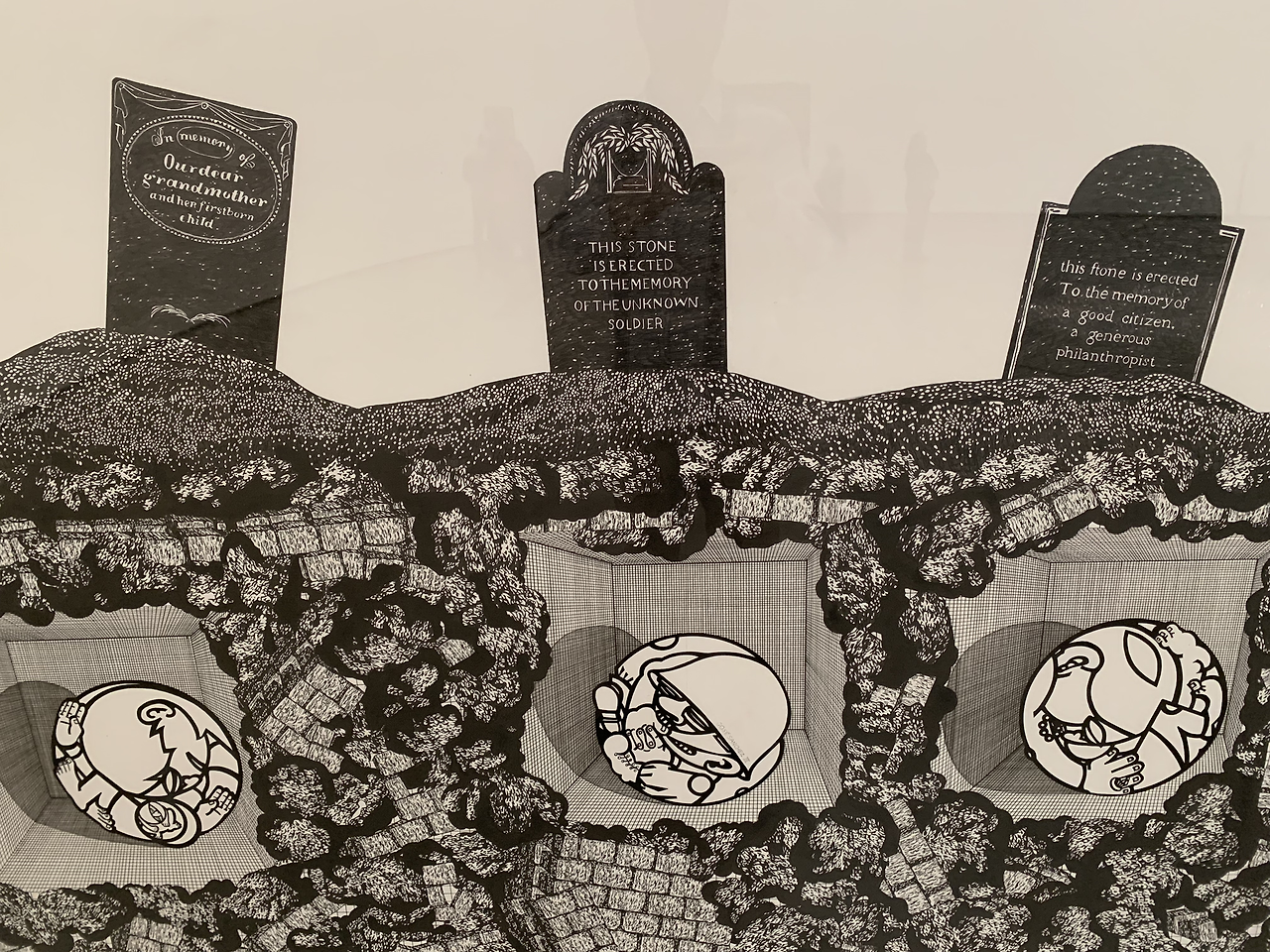다음으로 음모가 넘치는 세상을 살다가 죽은 이의 묘지가 들여다보이는데 저마다의 사연으로 죽음들이 동그랗게 둘둘 말려 있다.