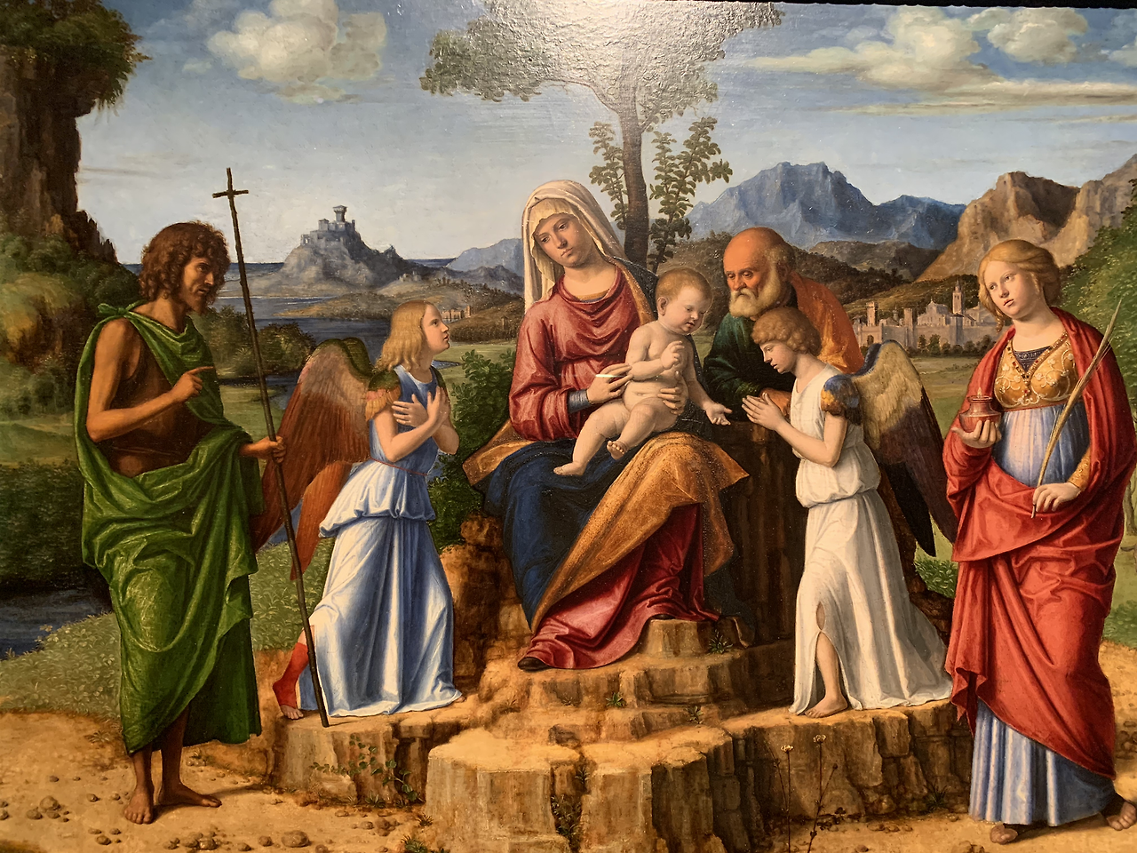 작품에서 고난의 행군에 지쳐 있는 성가족 주위로 평화와 안식을 상징하는 천사들과 세례자 요한 그리고 성스러운 빛과 지혜의 램프를 들고 있는 시라큐스의 성 루시아가 성가족을 위로하며 축복하고 있다.