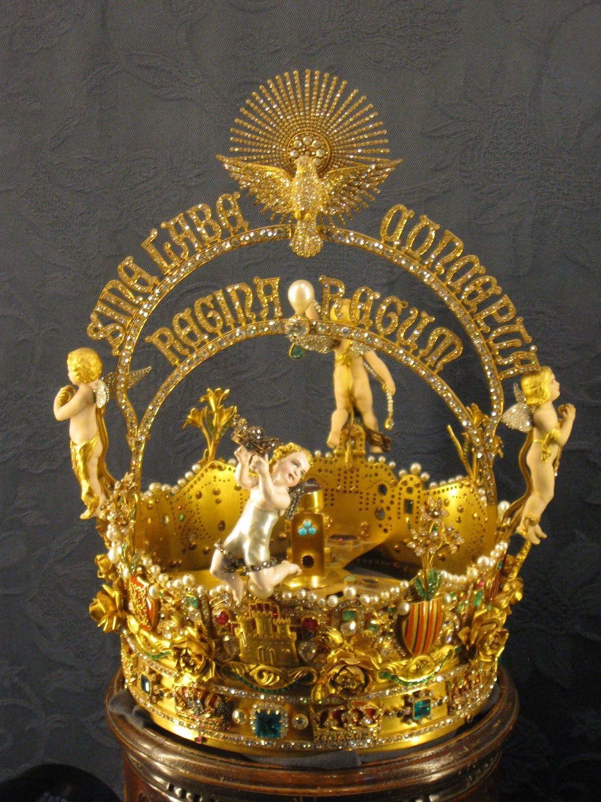 아래로 3명의 천사들이 떠받히고 있는 <성모관> 화려함의 극치를 보여준다. 곳곳이 진주알로 장식되어 있으며 심지어 예수는 몸통 부분이 모두 진주로 되어 있다. 이는 세계에서 가장 큰 진주로 만들었다고 한다. 맨 위에는 성령을 표현한 비둘기가 보인다.