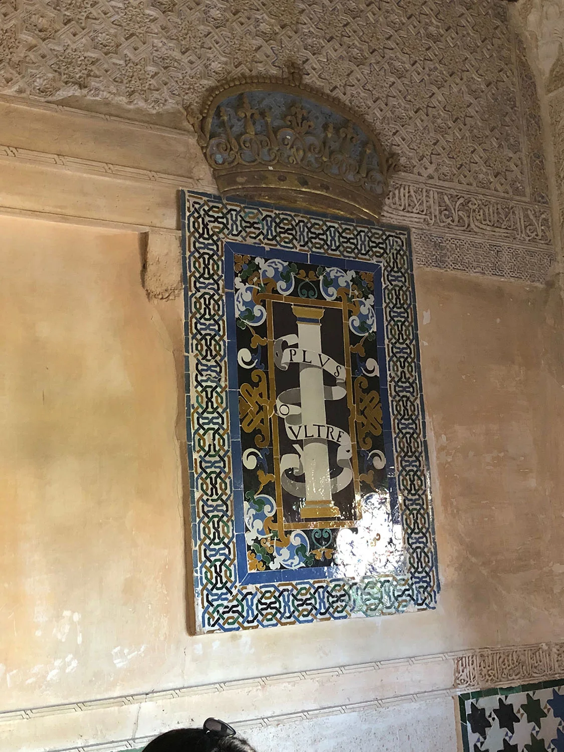 궁전의 중앙에 헤라클레스 기둥의 그림이 보인다. 고대 그리스 신화에 의하면 헤라클레스가 게리온이라는 괴물이 있는 이베리아 반도 끝으로 가기 위해 아틀라스 산맥을 잘라 냈는데 이때 대서양과 지중해 사이가 열리게 되었다는 신화가 있다. 그리고 아틀라스 산맥의 남쪽 끝과 북쪽 끝에 기둥을 세웠는데 이것이 헤라클레스 기둥이다.