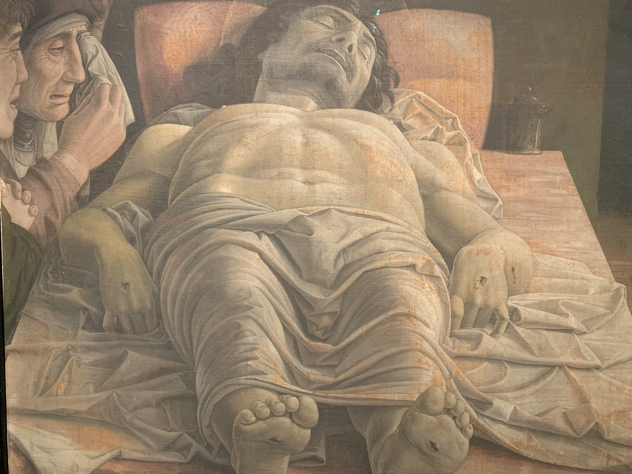 미술대학으로 사용되는 1층을 지나 2층 입구로 들어서서 제일 처음 만나는 작품은 피렌체 출신의 르네상스 화가 만테냐의 <죽은 그리스도>이다.