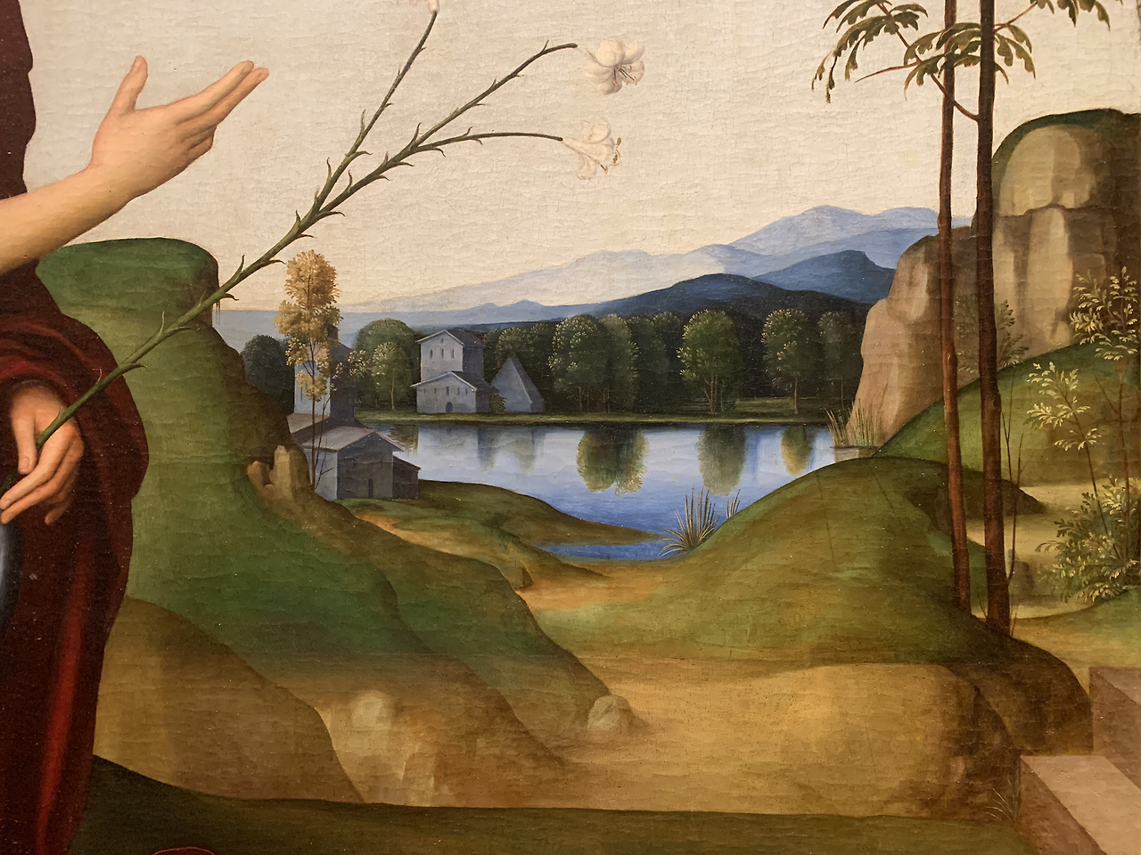 대천사 미카엘이 동정녀 마리아에게 신의 은총으로 예수님을 잉태하였다고 알려주는 이 장면에서 화가이자 수도사인 프란체스코의 신성하고 맑은 기운이 두 인물은 물론 작품 속 배경이 되는 강과 숲 그리고 산에 넘쳐난다.