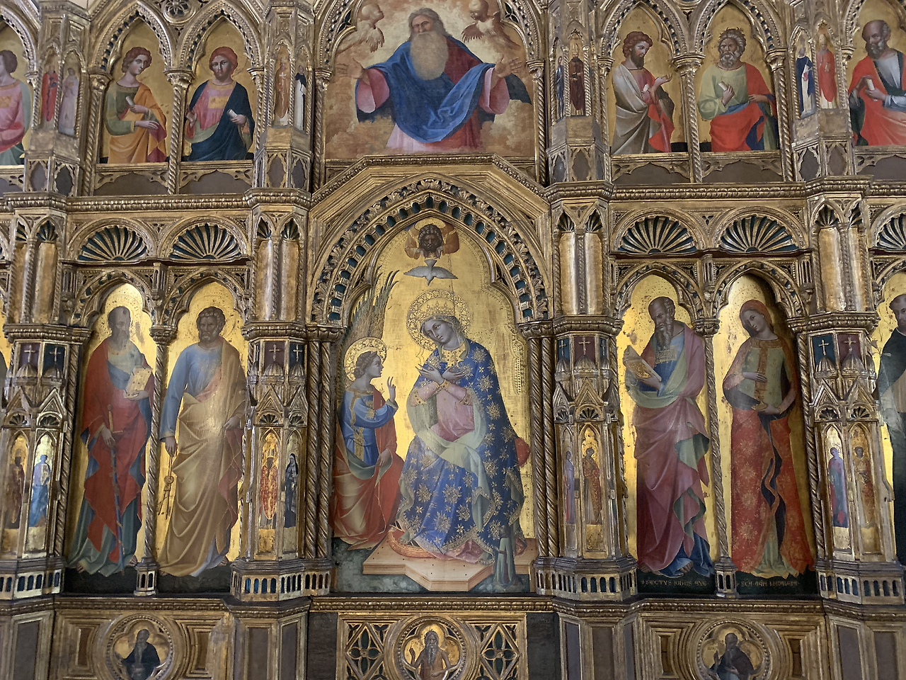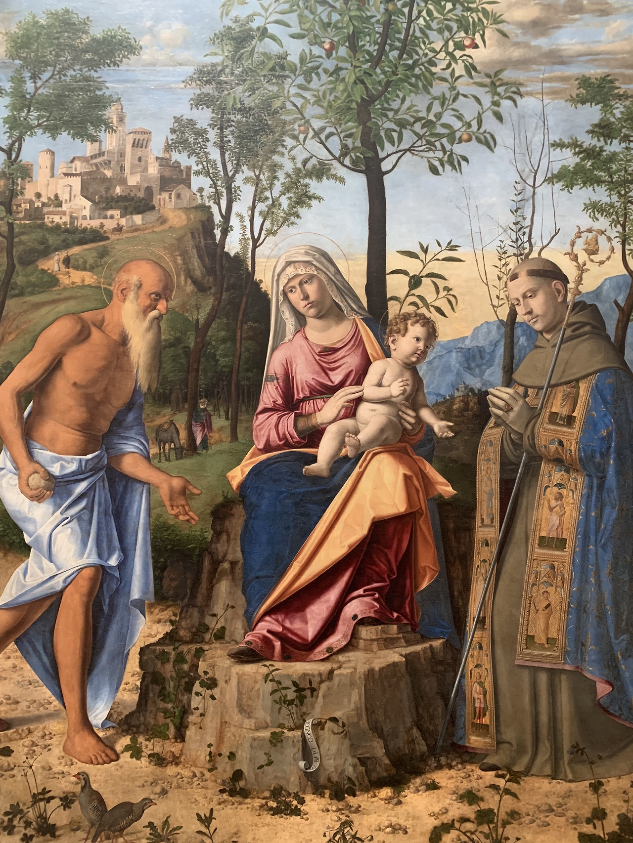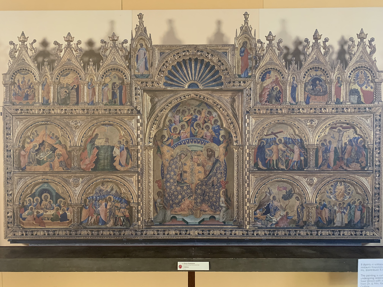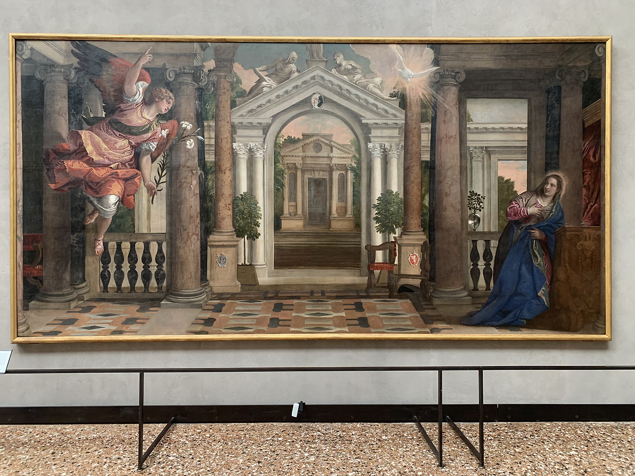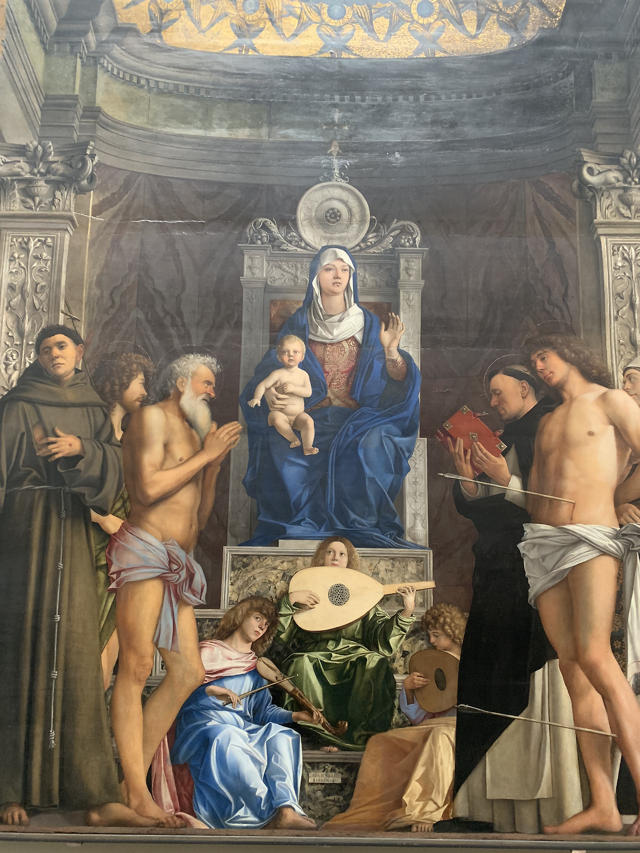 당시 보석보다 비싼 청금석인 라피스 아줄리를 갈아 만든 파란색이 성모 마리아의 옷부터 성인들의 옷까지 화려하게 장식하고 있어 당시 베니스가 얼마나 부유한 도시국가였는지 짐작하게 한다.