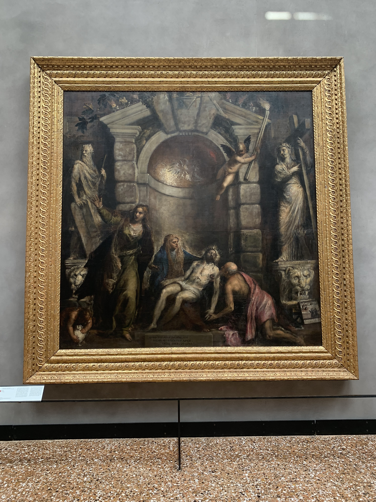 검은 동굴 속에서 십자가에서 내려진 예수님을 안고 있는 성모마리아와 예수 그리고 오열하고 있는 막달라 마라아의 모습이 선명하지 않고 어둠 속에서 불타는 듯 흘러내리고 있다.