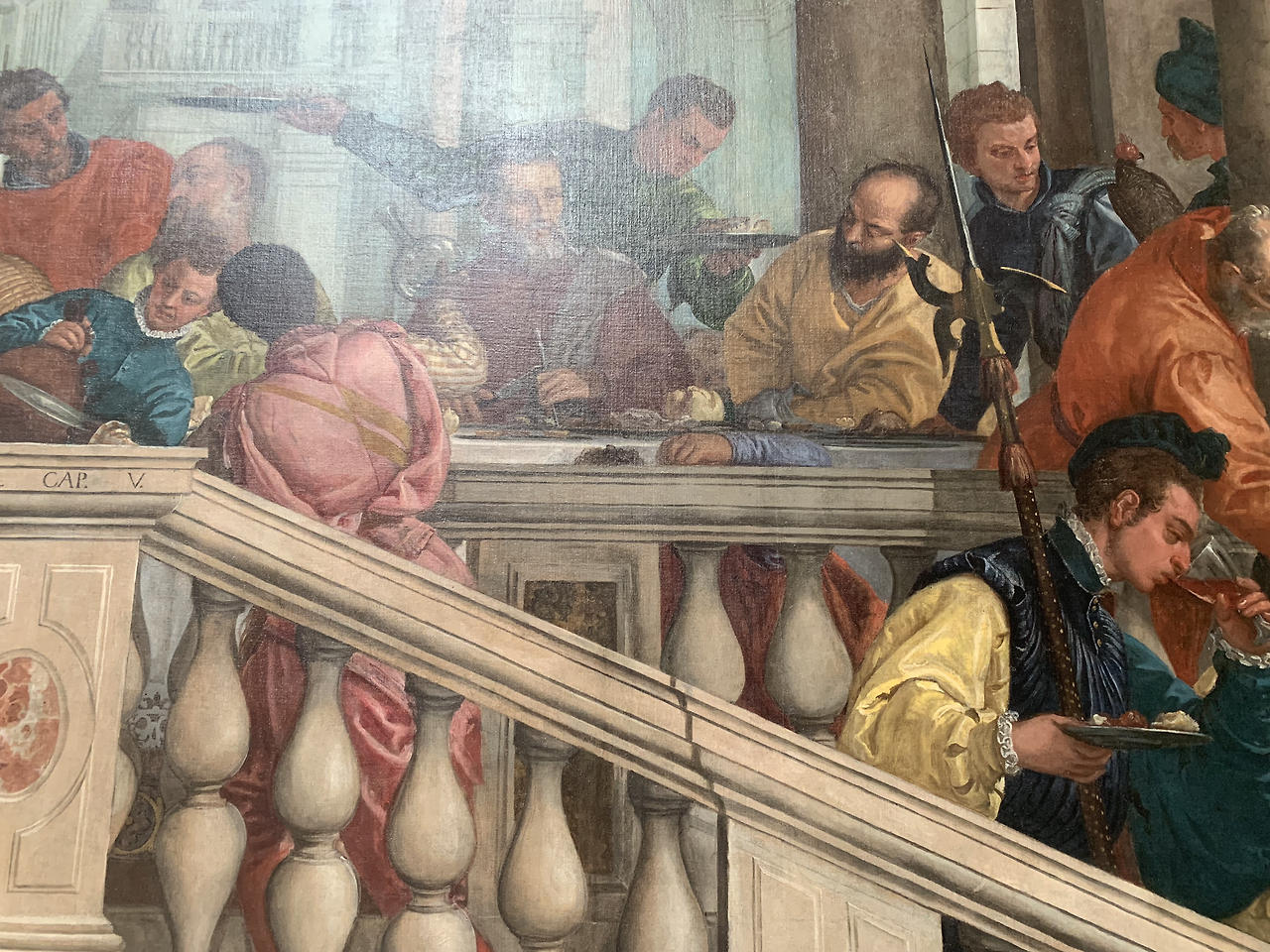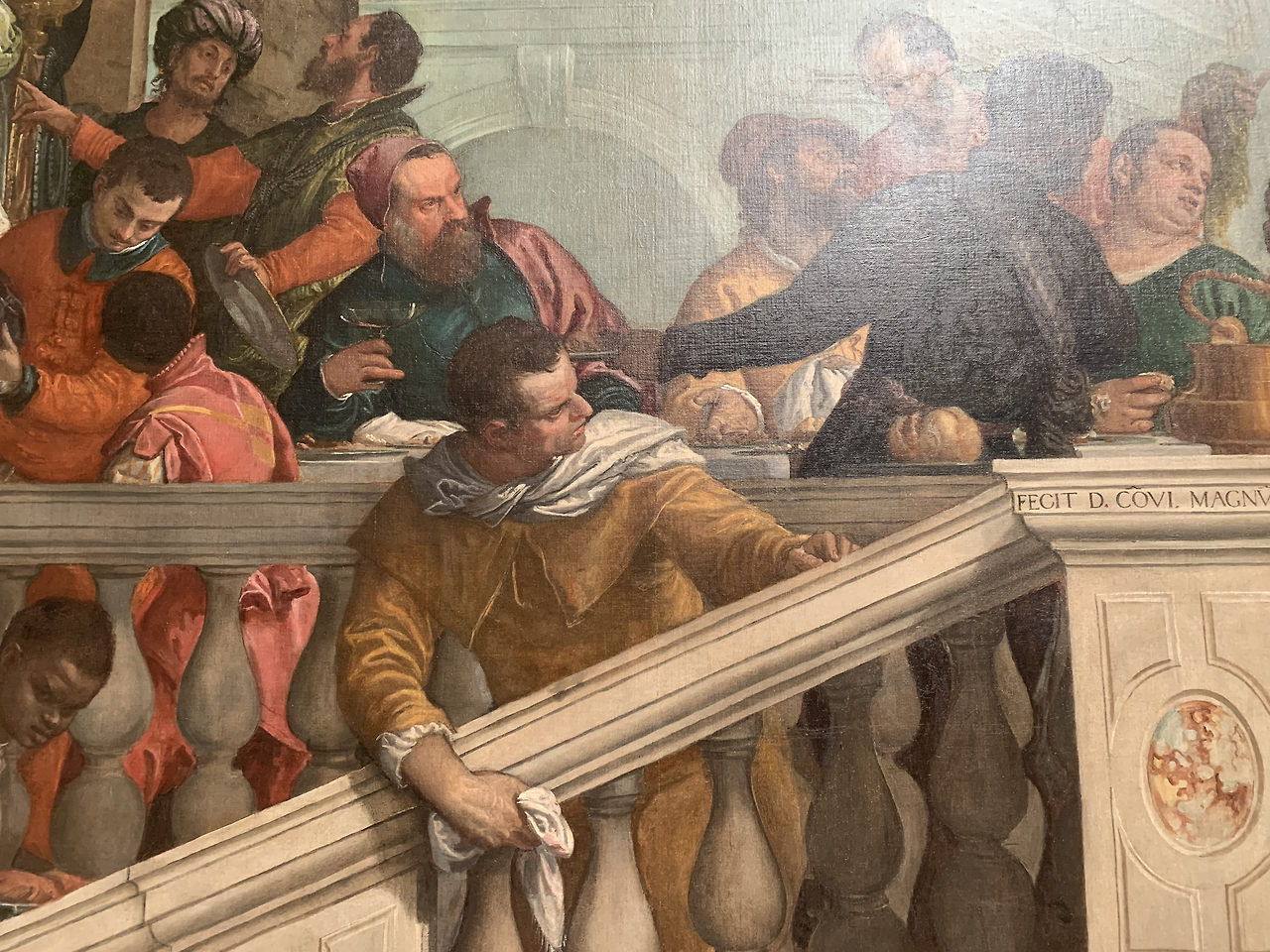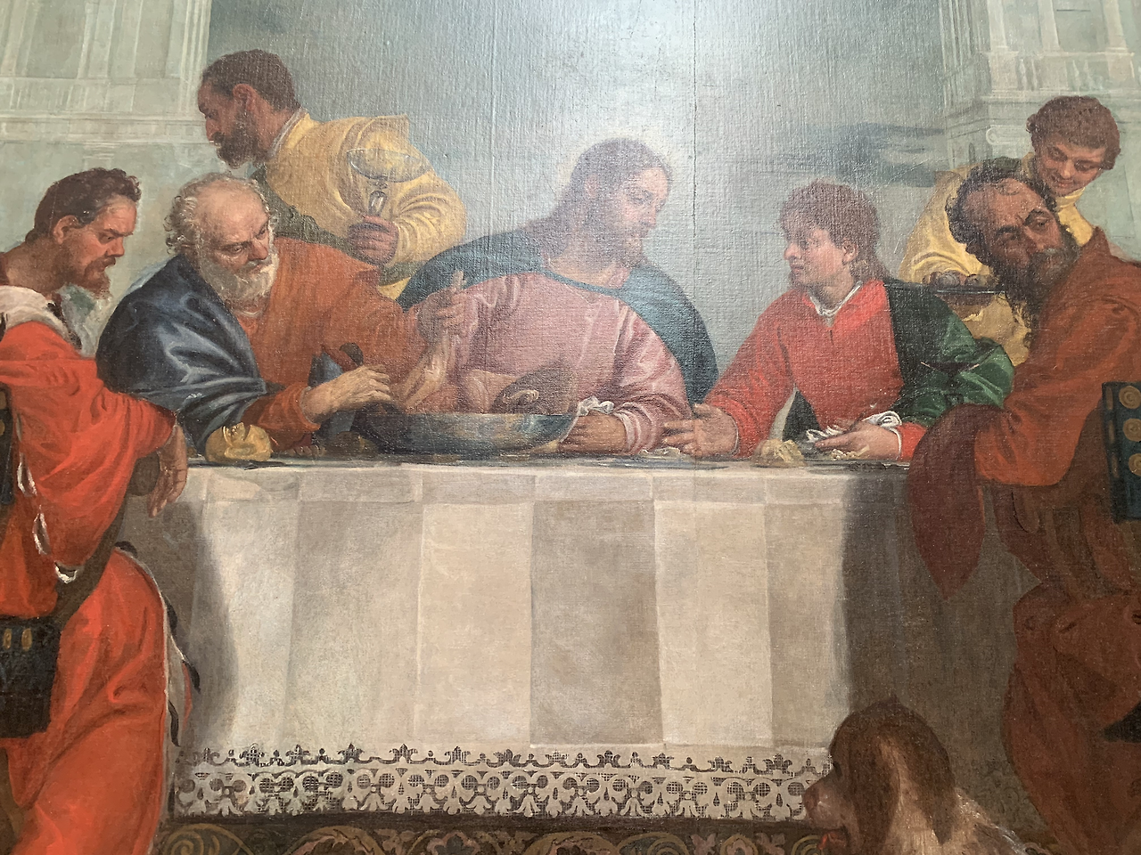 하지만 코피를 흘리는 하인과 어릿광대 그리고 강아지를 비롯하여 원숭이까지 등장하여 엄숙한 최후의 만찬을 베네치아의 한 귀족 집안 잔치같이 묘사하고 있다.