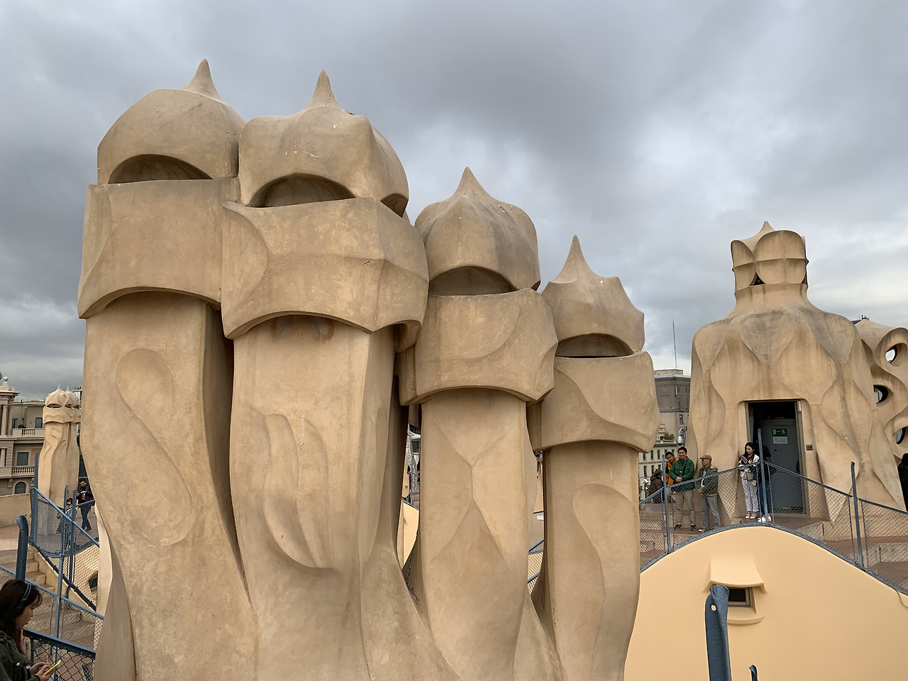 또한 환기탑이 옥상 여기저기에 흩어져 있는데 초록색인 샴페인 병 조각으로 장식되어 있다. 가우디는 연기가 꼬여서 올라가기 때문에 환기탑을 나선형으로 만들었다.