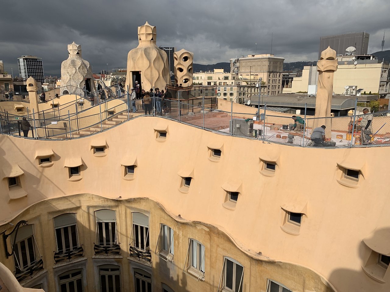 카사 밀라의 압권은 옥상에 있는 굴뚝과 출입구 그리고 환기탑이다. 로마 군인의 투구를 연상시키는 굴뚝은 하나 또는 서너 개씩 무리 지어 있다. 그리고 하얀색 타일로 장식된 비상구 계단 구는 소용돌이 모양을 하고 있다.