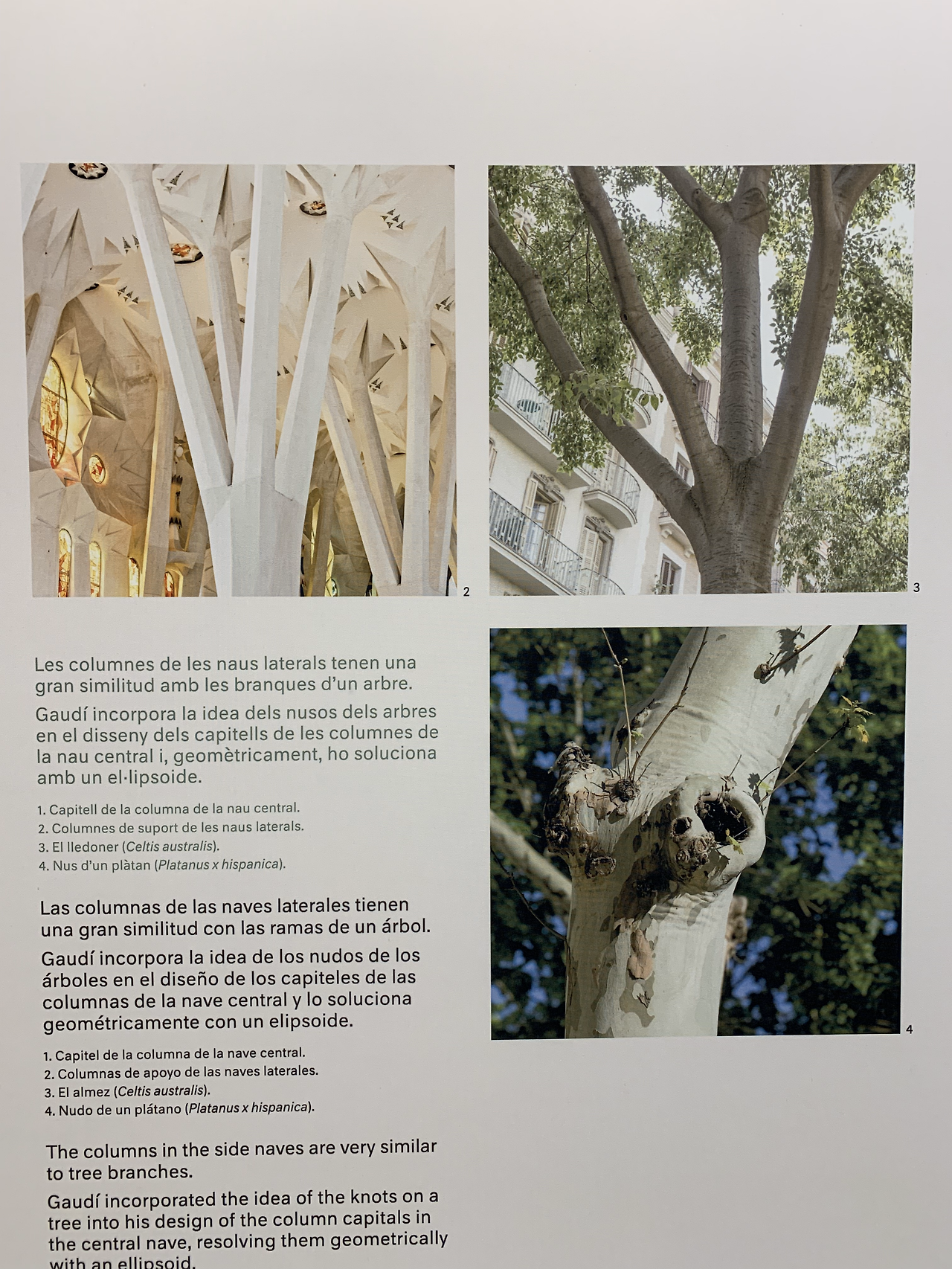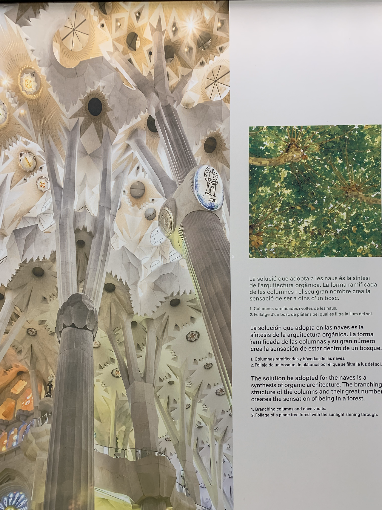 황홀한 빛을 배경으로 무수한 대리석 나무들이 들어서 있는 성당의 실내는 밀림처럼 압도적이다. 나무 잎 사이로 쏟아지는 빛을 표현하고 있는데 천장은 불규칙적으로 경사를 이루고 있으며 이를 나무 모양의 경사진 기둥들이 바치고 있다. 가우디는 성 가족 성당의 기둥들을 중력을 이용하여 과학적으로 설치했다. 이는 가우디의 오랜 실험 끝에 나온 방식이다.