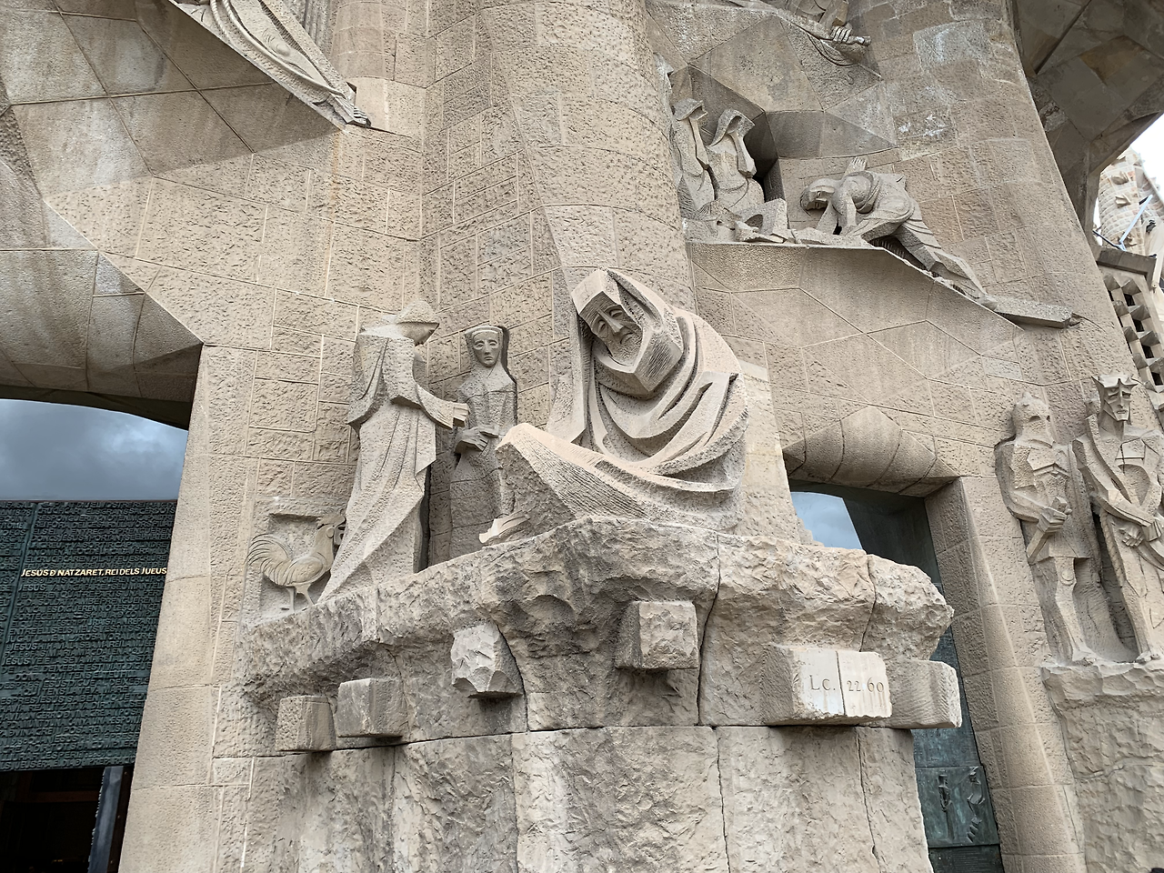 수난의 파사드 오른쪽 아래로 수탉이 보이고 한 남자가 머리를 숙이고 괴로워하고 있다. 예수의 예언대로 제1제자인 베드로가 수탉이 울기 전에 예수를 세 번 부인하고 회개를 하고 있는 장면이다.