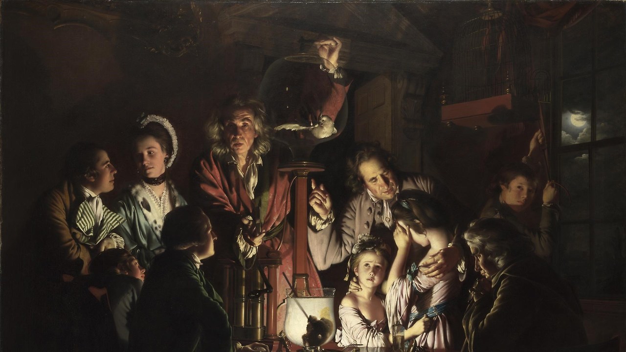 이 작품이 그려진 18세기는 이성과 계몽의 시대로 당시의 상황을 잘 보여준다. 작품 속 중앙 상단에 있는 커다란 유리 공속에는 하얀 앵무새가 들어 있다. 유리공 왼쪽에 서 있는 과학자는 유리 공과 연결되어 있는 펌프를 통해 공안에 들어 있는 공기를 빼내려고 하고 있다.