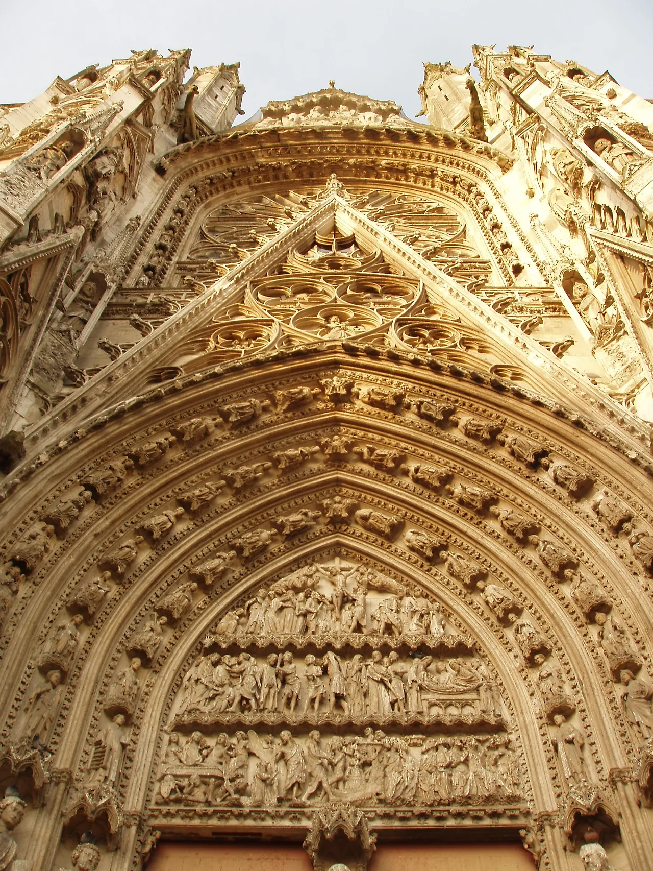 문 한가운데의 기둥엔 예수가 서있고 벽기둥사이에는 제자들이 나란히 서있다. 그 위로는 단순하고도 수려한 장식의 장미창이 자리하며, 창 위쪽으로는 천상모후의 관을 쓴 성모 마리아의 대관식 장면이 조각으로 아로새겨져 있다.