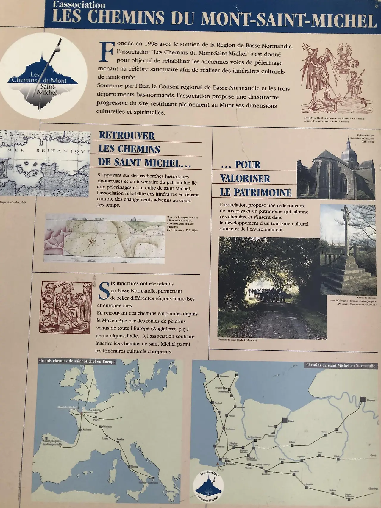이탈리아의 몬테 갸르갸노를 출발하여 미슐레를 지나 몽생미셸에 이르는 순례길을 상징적으로 도안한 현수막이 인상적이었다면 인상적이었다. 설명현수막 곳곳을 장식한 성미카엘 천사장의 모습은 몽생미셸에서 익히 본 눈에 익은 천사의 앳된 얼굴을 닮았다.