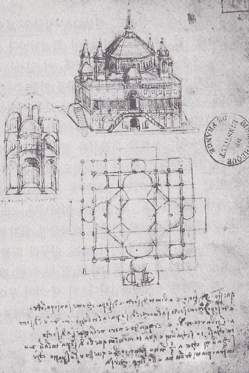 대성당 앞 광장 카페에 앉아 커피를 되질하다 어젯밤 읽던 책에서 본 삽화를 다시 펼쳐본다. 15세기 이탈리아 르네상스와 프랑스 르네상스까지 견인했던 레오나르도 다빈치가 스케치한 성당 삽화다. 정확히 어느 성당을 그린 것인지, 앞으로 지어질 성당을 그린 것인지는 알 수가 없지만 다빈치가 그린 스케치는 성당의 정사각형 도면까지 담았다.