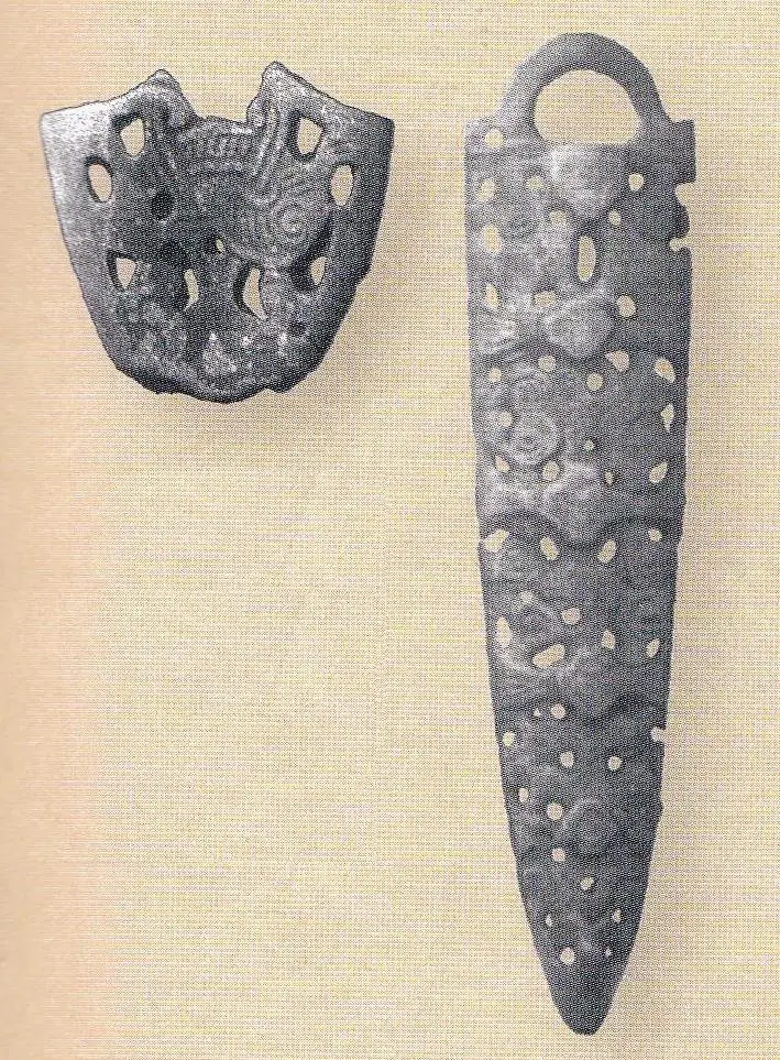 칼집 장식품은 전형적인 스칸디나비아 유물로서 동으로 제작되었으며, 구멍이 숭숭 뚫려있는 것이 특징이면서 짐승을 움켜잡은 무늬나 식물형태의 긴 띠 문양을 하고 있습니다.