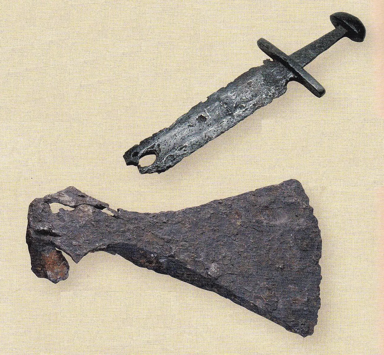 [1] 이 둘 모두는 9세기 후반에 사용된 것으로 추정됩니다. © 루앙 고고학 박물관. 검은 요한 델랑드 사진이고 도끼는 프랑수아 뒤귀에 사진.