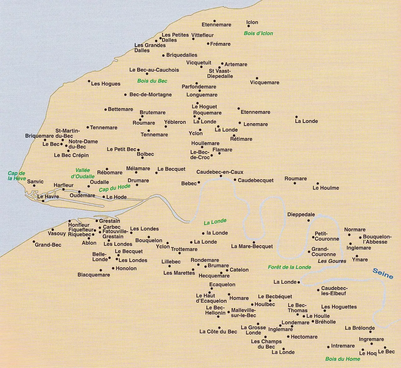 노르망디에 정착촌을 건설한 바이킹들은 이미 존재하는 지명들을 체계적으로 변형하고자 시도하지 않았습니다. 예로 들어 노르망디에 속한 주교좌에 해당하는 여섯 개의 도시들은 원래 부르던 대로 도시 이름들을 그대로 놔뒀습니다. 그러나 코, 훼깡, 베른느발 지역에서는 지명들을 바꿔 불렀죠.
