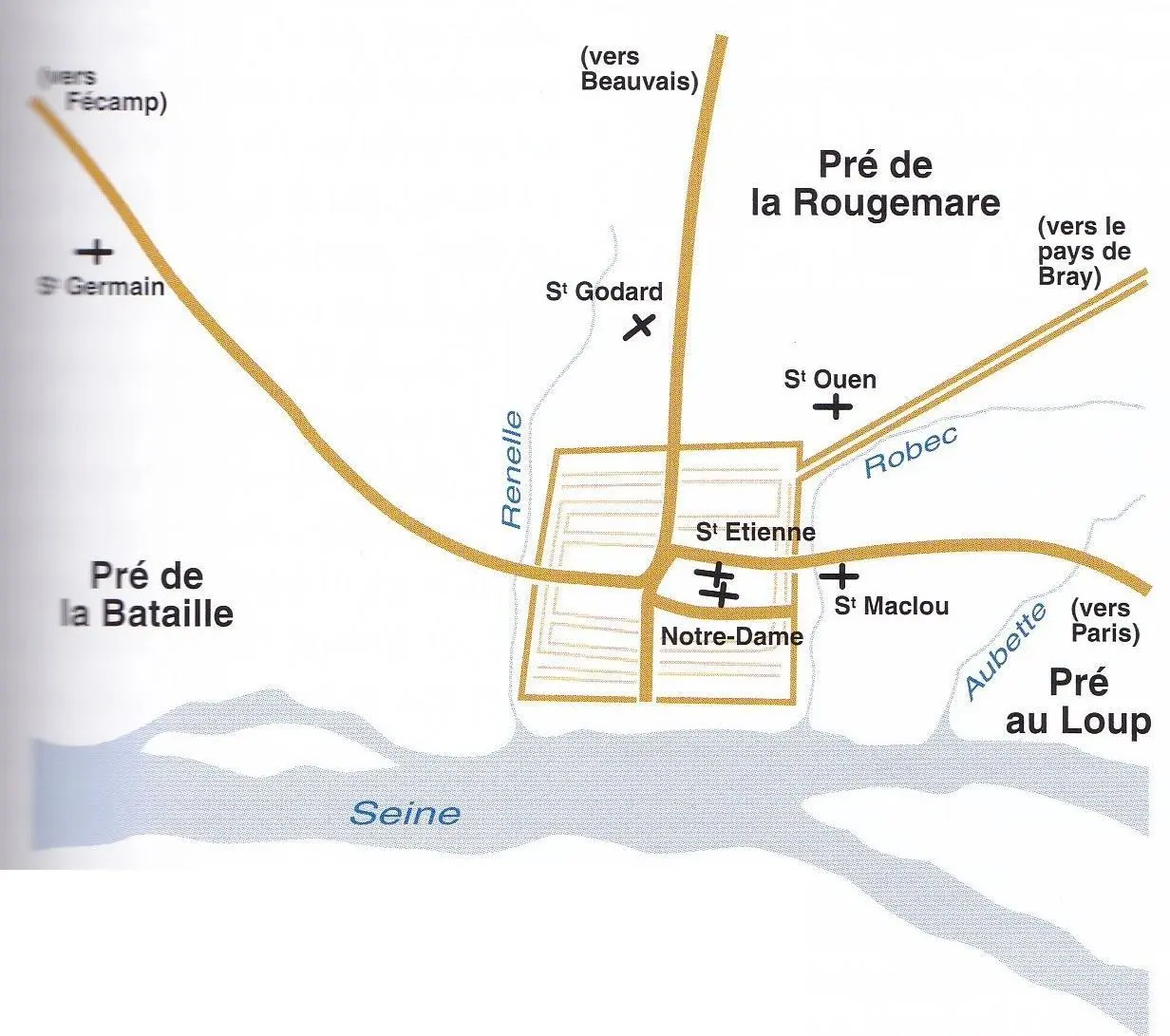 10세기 때의 루앙. 도성의 구획은 바이킹에 의해 엄격하게 정해졌습니다. [1]