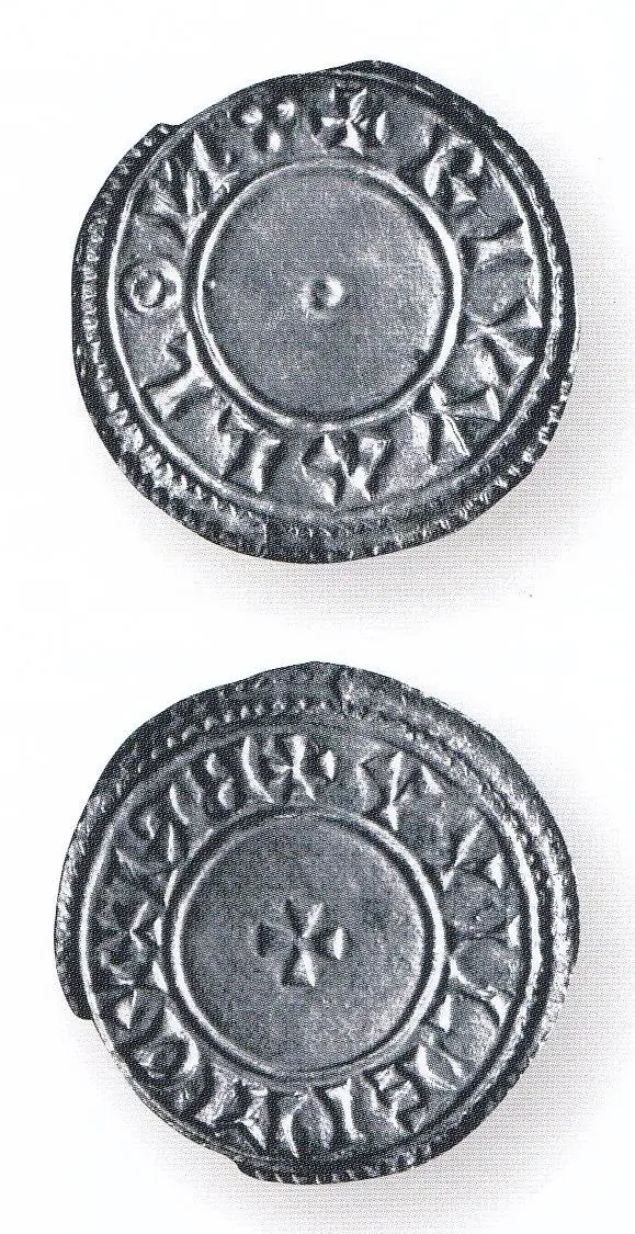 [1] 앞면에는 브르타뉴 인들의 공작 기욤(WILEIM DUX BRI(TONUM))이 적혀있고, 뒷면에는 십자가 문양과 함께 무적의 인물이란 글귀가 새겨있다. © 쟈끌린느 삐레 르미에르 사진.