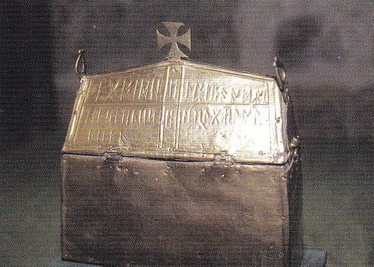 [2] 모흐탱의 유골함에는 덮개에 룬 문자가 새겨진 글귀가 적혀 있습니다. “주여! 애당을 도우소서. 여기 유골함을 바치나이다.” 그러나 적혀 있는 문자는 앵글로 색슨 계통이 사용하던 룬 문자입니다. © 장 르노 사진.