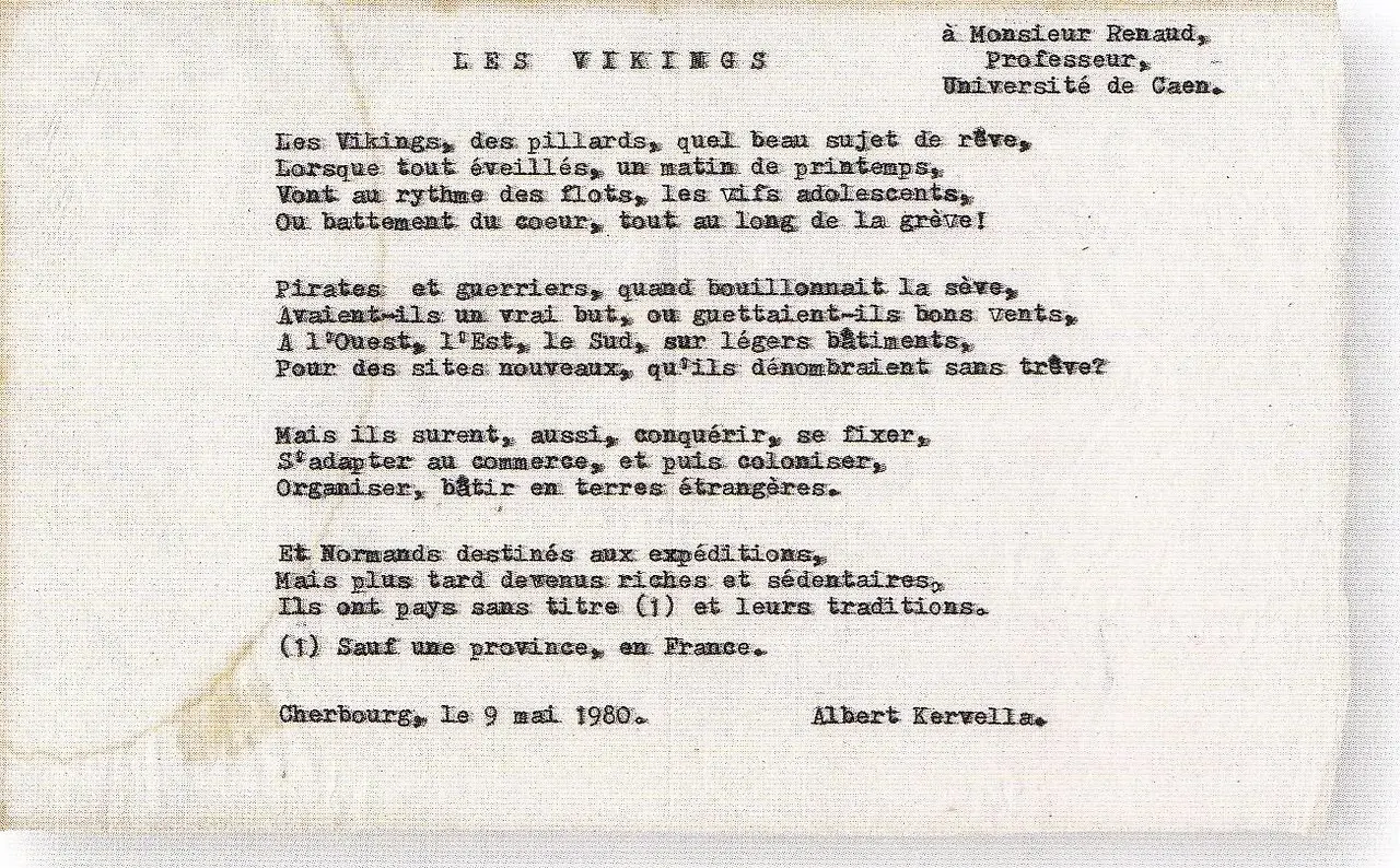 “노르망디에서는 정기적으로 신사 한 분이 바이킹들에 대해 이야기하고자 출현한다. 그는 일찍이 군 나팔수로 채용되었던 아주 순박한 사람이었다. 그는 바이킹 해적선인 드라카르(drakkar)를 타고 한 바퀴 짧게 돌아보면서 방청객들로 하여금 뿔 속에 마시기 위한 꿀물 한 방울을 받아 넣을 것을 주문했다. 전쟁의 피비린내 나는 상황과 늑대에 물어뜯긴 시체들을 상기시키기도 했다. 그리고 모든 참석자들이 아주 만족할 것이라는 생각 하에 각자 다음과 같은 문장을 되풀이하게 만들었다. “나는 바이킹이다. 너는 바이킹이다. 우리 모두는 바이킹들이다.” 그리고 그들은 각자 집으로 돌아갔다. 추위에 부들부들 떨지 않을 만큼 자신의 몸을 잘 추스르면서.”