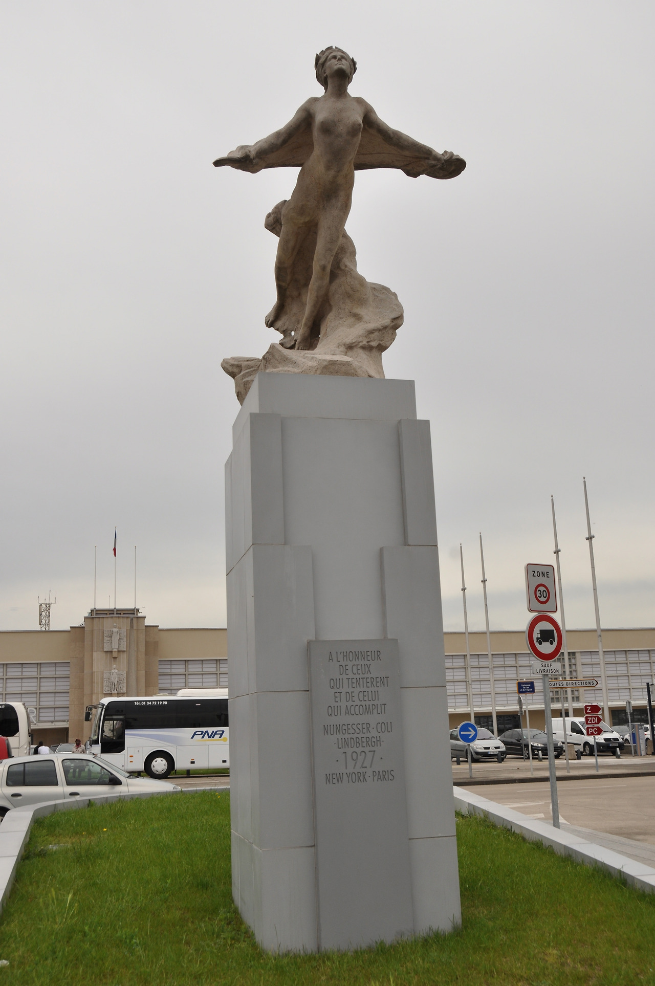 에트르타 시당국은 이 두 사람의 대서양 횡단 비행 시도를 기념하여 1927년 아몽 언덕에 그들을 추모하기 위한 기념비를 건립하였는데, 높이가 24미터에 달하는 화살촉 모양의 뾰족한 조형물은 그들이 몰고 대서양 횡단 도전에 나선 비행기 ‘흰 새’를 상징한다. 그러나 1942년 2차 세계대전이 발발하여 독일군에 의해 파괴되는 바람에 에트르타 시당국은 1963년 조형물을 다시 건립해야만 했다.