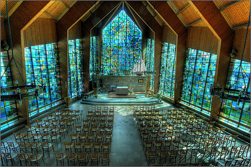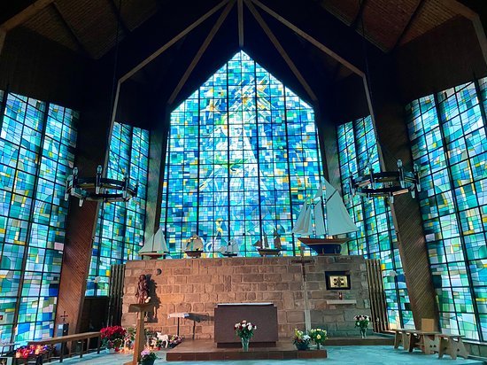 시골 교회의 소박하고 정결하기까지 한 아취를 건물 전체에서 느끼기에 충분한 외관에도 불구하고 서쪽 파사드 정면 입구로 들어서면 제단을 향해 펼쳐진 스테인드글라스의 푸른 바다에 홀리듯 빠져들고 만다. 이 시선을 압도하는 색유리창의 파노라마는 성당의 벽면을 온통 뒤덮고 있다. 제단 바로 뒤쪽 유리창에 새겨놓은 흰옷을 입고 서있는 인물의 추상은 아마도 뱃사람들을 구원해 주는 성모 마리아일 것이다.