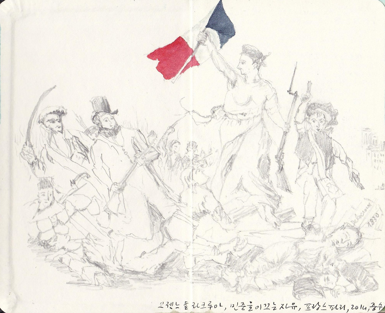 떠오르는 기억 하나, 파리 루브르 박물관에서 나는 한참 동안 들라크루아의 그림 <민중을 이끄는 자유>를 바라보고 또 바라보고 있었다. 그림에서 시선을 뗀 경우는 누군가 내게 와서 모나리자가 걸려 있는 전시실 방향을 물었을 때뿐이다. 새로운 주제전이 개최될 때마다 루브르 박물관을 드나들면서 이제는 들라크루아의 그림을 외울 정도로 익숙해졌다. 그래서 이번에는 그림만 바라보는 것이 아니라 들라크루아의 그림을 한번 복사해 보자는 생각까지 하게 되었다.