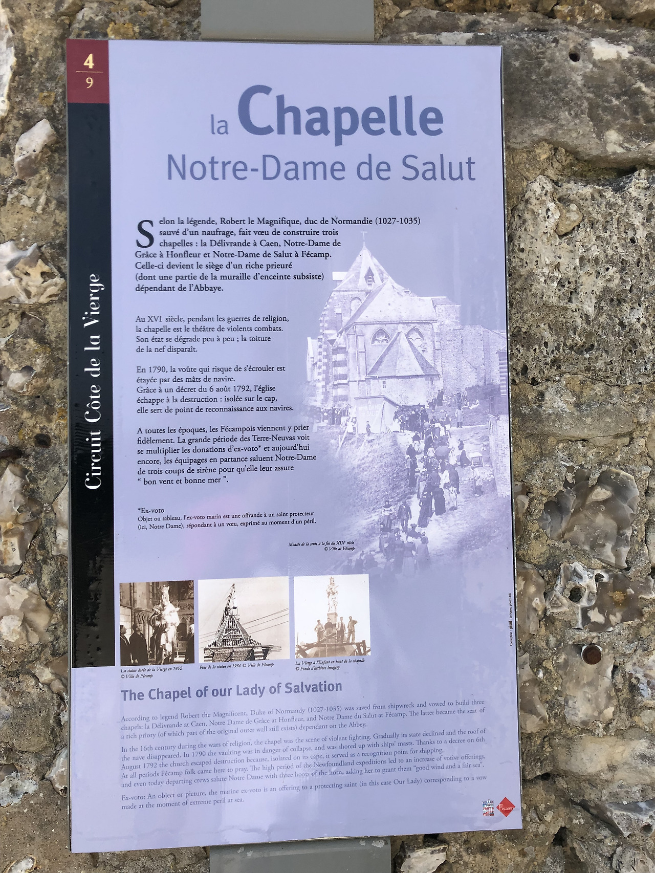 안내판에는 “꼬뜨 드 라 비에르쥬(Côte de la Vierge)라는 부지에 세워진 구원의 성모 마리아 성당은 ‘선원들을 위한 기도처’로 알려져 있으며, 훼깡의 화녜 곶(Cap Fagnet de Fécamp) 북쪽 절벽에 세워져 있습니다. 13세기 이래로 순례자들이 반드시 거쳐 가는 장소로 유명합니다.”라 적혀있다.