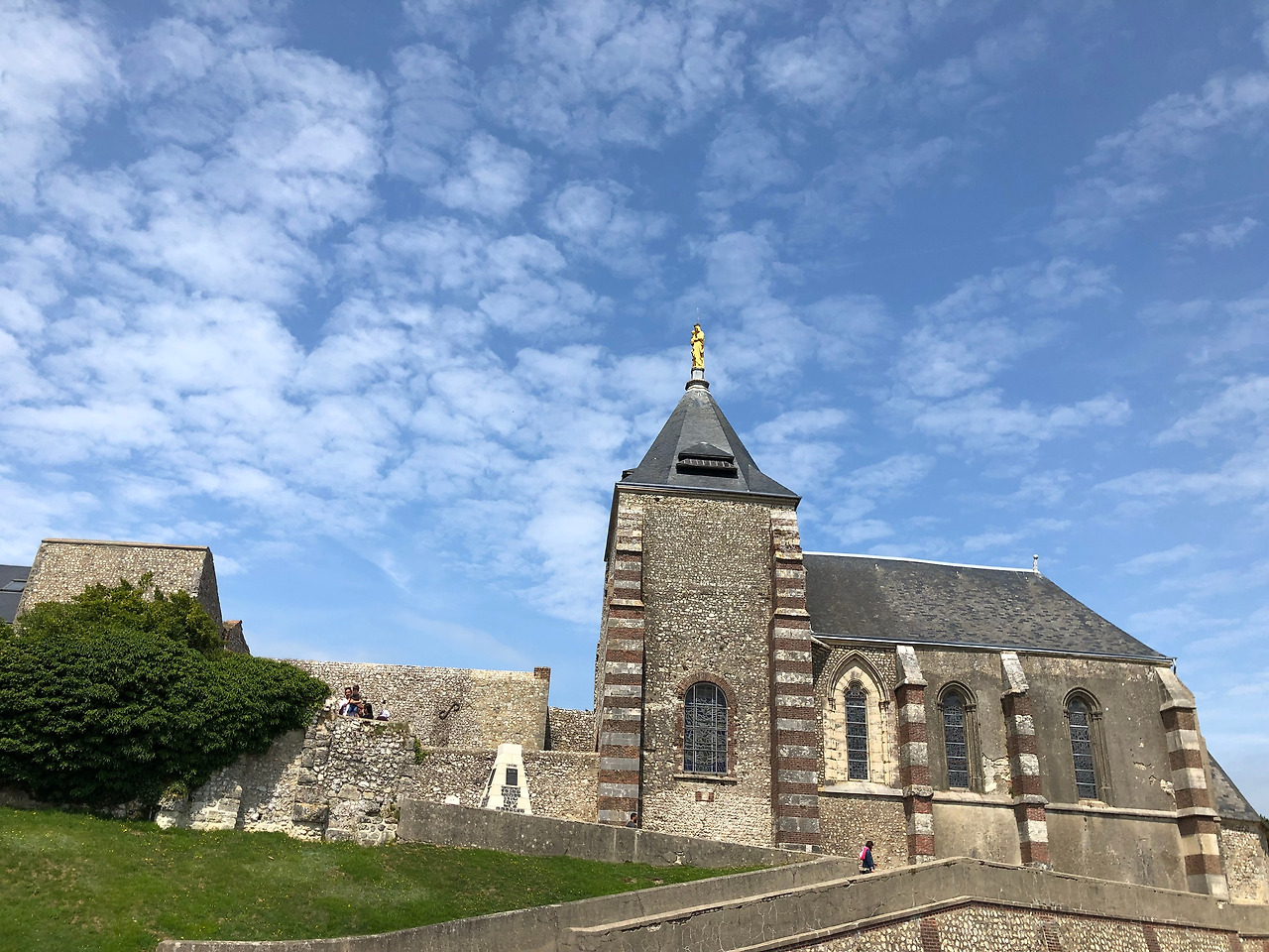 “구전에 따르면, 이 작은 기도처는 난파선에서 살아남은 노르망디 공작(1027-1035)에 의해 11세기에 설립되었습니다. 13세기에 지어졌지만, 지금은 트랑셒(Transept : 제단을 중심으로 한 좌우 교차 회랑)과 제단 일부에서 그 흔적을 찾아볼 수 있을 뿐입니다. 16세기 신, 구교 간의 내전 시에는 치열한 전투의 현장이기도 했습니다. 전쟁이 격렬해지자 본당의 지붕마저 사라졌습니다. 1790년에 붕괴 위험에 처한 벽들은 배의 돛대로 지탱되기에 이르렀습니다. 그러다가 1792년 8월 6일 대혁명 직후 제정된 법령 덕분에 대혁명 여파로 인한 교회 건축물이 사라지는 경우만은 겨우 면했습니다. 오늘날 첨탑에서 보는 성모 마리아와 아기 예수의 금박을 입힌 조각상은 원래 1902년 도시의 선주가 기증한 것으로 제2차 세계대전 중 1942년 행해진 폭격으로 종탑이 무너지는 바람에 사라졌다가 최근에 복원한 것입니다.”라고 친절하게 성당을 설명해 준다.