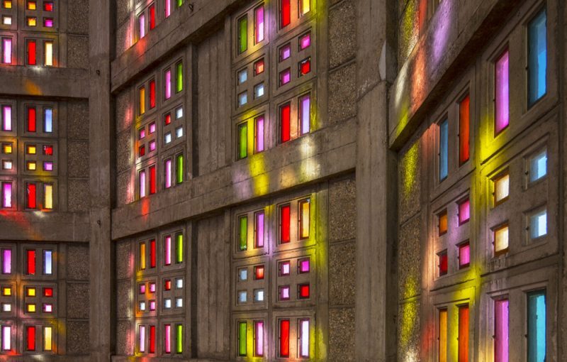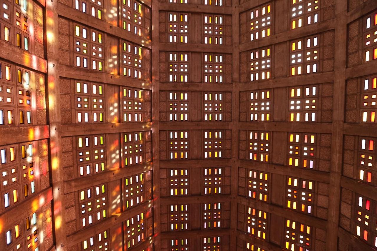 1952년부터 1957년까지 거의 378 제곱평방미터에 달하는 벽면에 12,768개의 색유리로 구성된 스테인드글라스 창문은 생 쥐스트 쉬흐 루아르(Saint Just sur Loire)에서 만든 소위 ‘골동품’ 유리로 제작되었다. 입으로 불면 불규칙하고 뉘앙스가 강한 이 유리판은 조립식 정사각형 스크린 안에 통합되고 외부에는 흰색유리가 덧장착되어 있다.