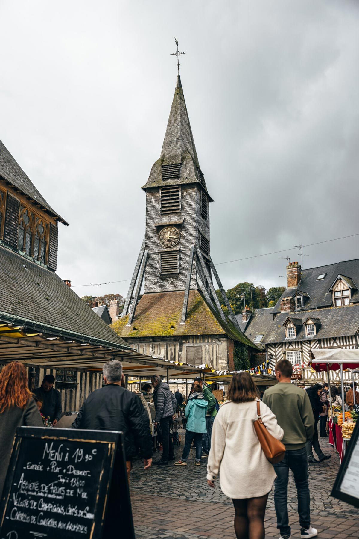 결혼식이 토요일 오전이 아니고 오후인 것은 토요일 오전엔 장이 서기 때문이다. 성당 앞마당은 마을장터로 변한다. 옹플뢰르 시당국이 내건 캐치프레이즈는 100퍼센트 신선하고 품질이 뛰어난 자연산 유기농 농수산물이 마을장터를 통해 제공된다는 점이다. 그걸 믿어야 할지 말지는 마을장을 구경하면 금방 깨달을 수 있다.