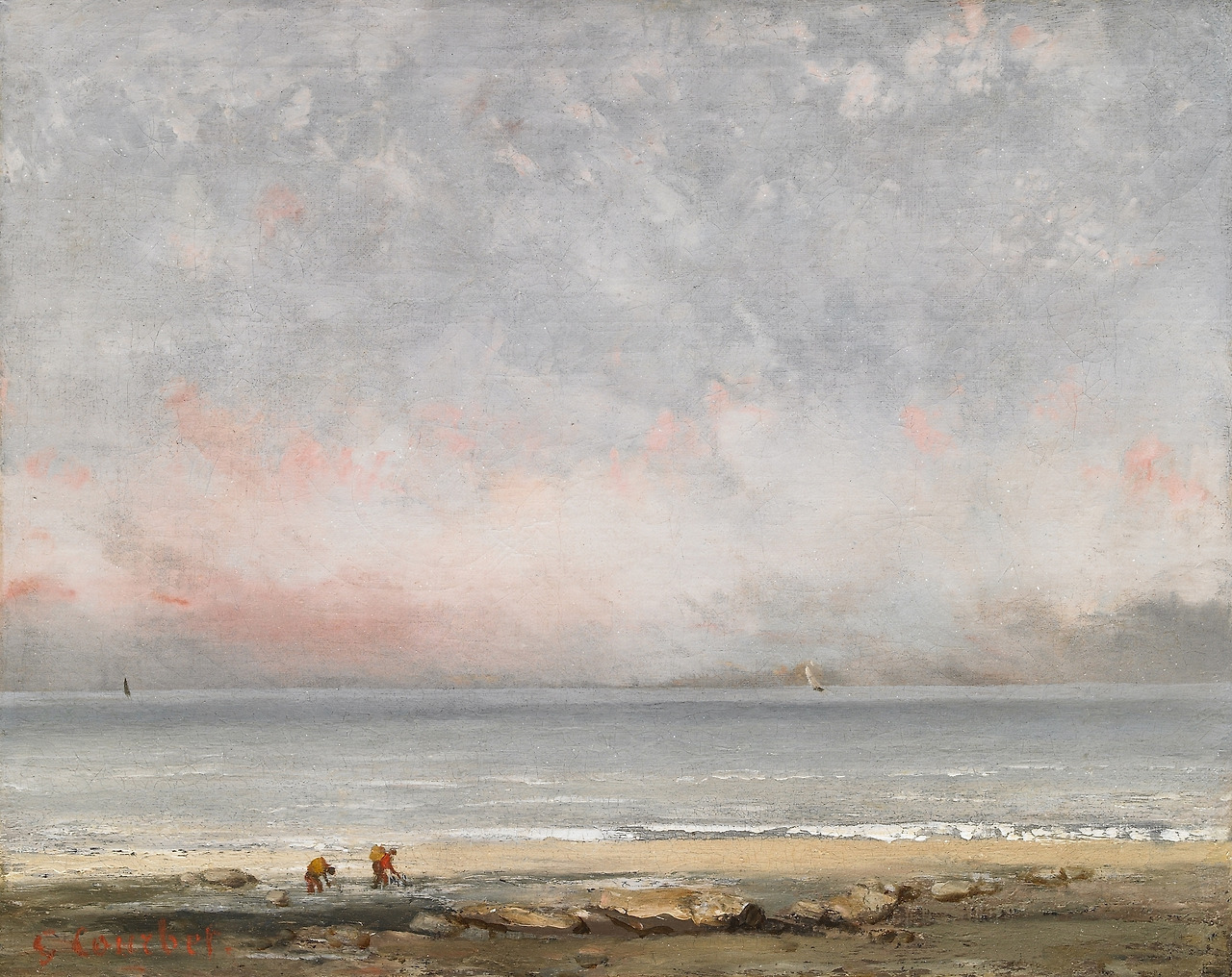 인물이 제거된 그림, 그저 단순한 화면엔 오직 조개 캐는 이들밖에 없는 그림, 구름 속에 부드러운 분홍빛 햇살이 힐끔거리는 하늘, 멀리서 동쪽을 향해 바람이 부는 가운데 돛을 활짝 편 두 척의 배, 백사장으로 밀려오는 파도 이게 전부다.