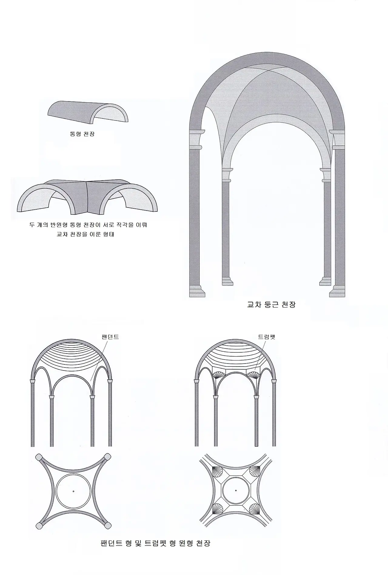 11세기 건축가들은 건물 지붕에 반원형 둥근 천장을 설계함으로써 교회 내부에 좀 더 커다란 실내공간을 확보할 수 있었습니다. 그뿐만 아니라 교차 형 둥근 천장 역시 풍부하게 활용하였죠. 교차 형 둥근 천장은 주로 좌우측에 나 있는 회랑들에 적용했습니다.