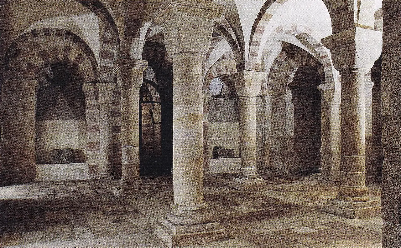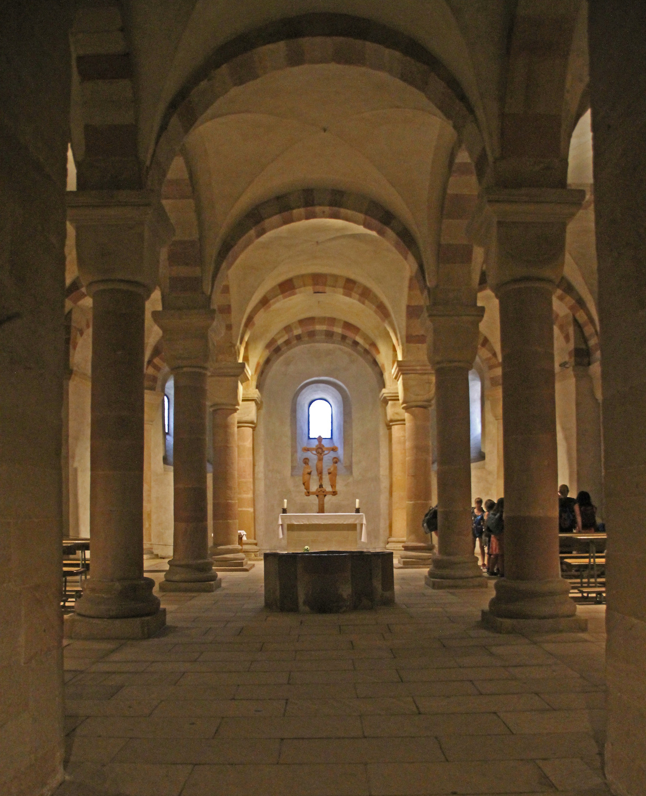 11세기에서 12세기에 걸쳐 완성된 슈파이어 대성당의 지하교회는 지상층의 본당 내진과 좌, 우측 회랑 바로 밑 지하에 들어섰습니다. 천장은 둥근 형태이며, 바닥에서 천장까지의 높이는 6.5미터에 이릅니다. 당시 알프스 북쪽에 들어선 건축물 가운데 가장 거대한 크기입니다. 지하교회는 프랑크 족의 일파인 살라 족이 세운 살라 왕조 시기에 황제를 위한 지하묘지(네오크로폴)로 사용되었습니다.