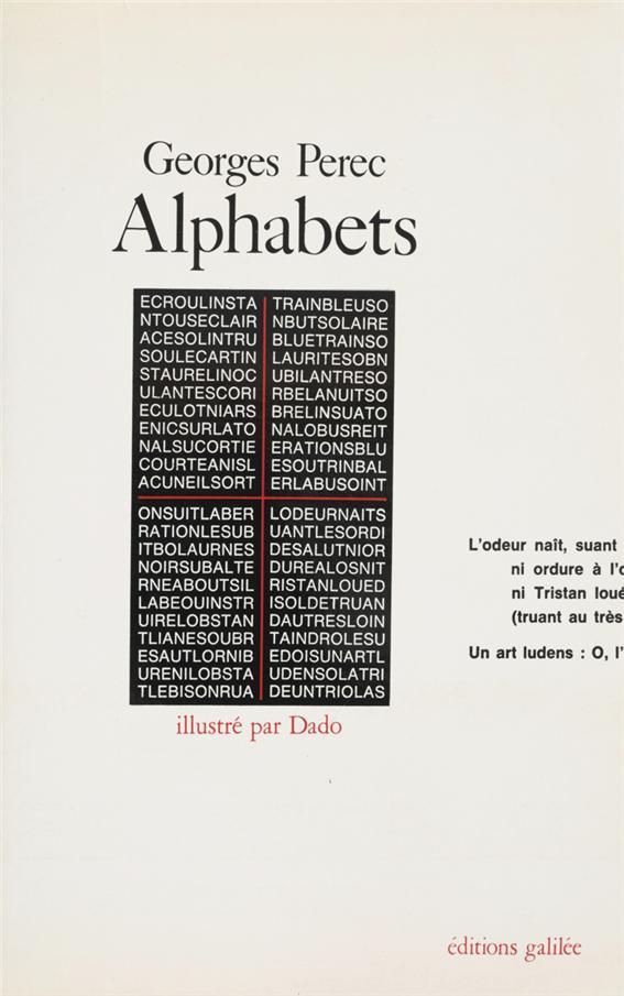 조르주 페렉(Georges Perec)에게 있어서 시에서의 중요성은 눈과 귀라는 두 감각 기관을 서로 잇는 새로운 관계를 수립하는 것이었다. 1988년에 페렉을 다룬 저술을 통하여 클로드 뷔흐쥴랭(Claude Burgelin)이 설명한 바와 같이, 페렉의 시집 “『알파벳(Alphabets)』의 시들은 한 페이지 안에 가로와 세로가 모두 열한 자씩 정사각형으로 되어있는데, 이 큐빅은 그 자체로 폐쇄되어 있으며, 닫힌 상태 속에서(던져진 주사위, 혹은 산포(散布, dispersion)에 따른 우연 자체로) 읽는 이로 하여금 질식할 것 같은 느낌을 불러일으킨다. 다른 한편으로 보면, 퍼즐이 같은 문자들을 해체함으로써 문자들이 이루는 고요에 구멍을 뚫는 서로 같은 문자들의 산개(散開, déploiement)”를 보여주는 이러한 시 형태는 역설적으로 페렉이 ‘시의 산문으로서의 번역’이라 부른 것에 해당한다.