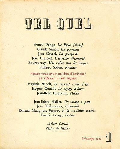 하지만 이러한 태도는 지난 12년간의 텔켈주의(telquélisme : 문학잡지인 <텔 켈(Tel Quel)> 지에 작품을 게재하던 일군의 작가들의 창작 태도를 가리킴)라는 용어와 궤를 같이하는 것이기도 했다.