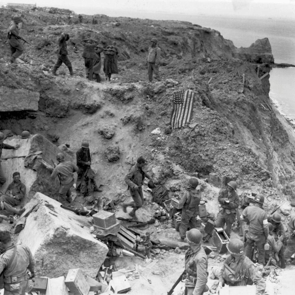 미군 최전방 돌격대원들은 용기를 내 폭발의 굉음과 기관총 사격에도 불구하고 절벽을 기어올라갔다. 독일군에 의해 종종 절단된 갈고리 사다리는 경사진 오르막 벼랑을 타고 오르는 레인저를 마침내 절벽 꼭대기에 우뚝 서게 만들었다.