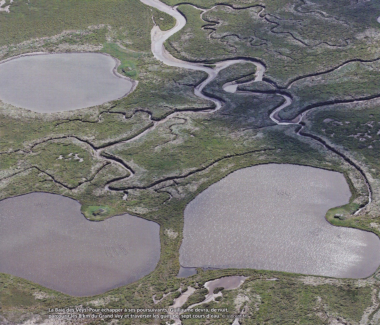 추격자들을 따돌리기 위해 기욤은 밤새도록 7개나 되는 물웅덩이 못을 건너뛰어 커다란 베 만(Grand Veys)을 8킬로미터나 말을 타고 달렸다. 중세 사가들인 바스와 브누아의 증언에 따르면, 1047년의 음모에 따른 어린 공작이 말을 타고 도망친 도망자의 탈주로는 베(Veys) 만(灣)을 가로지르는 늪으로 난 길이었다. [1]