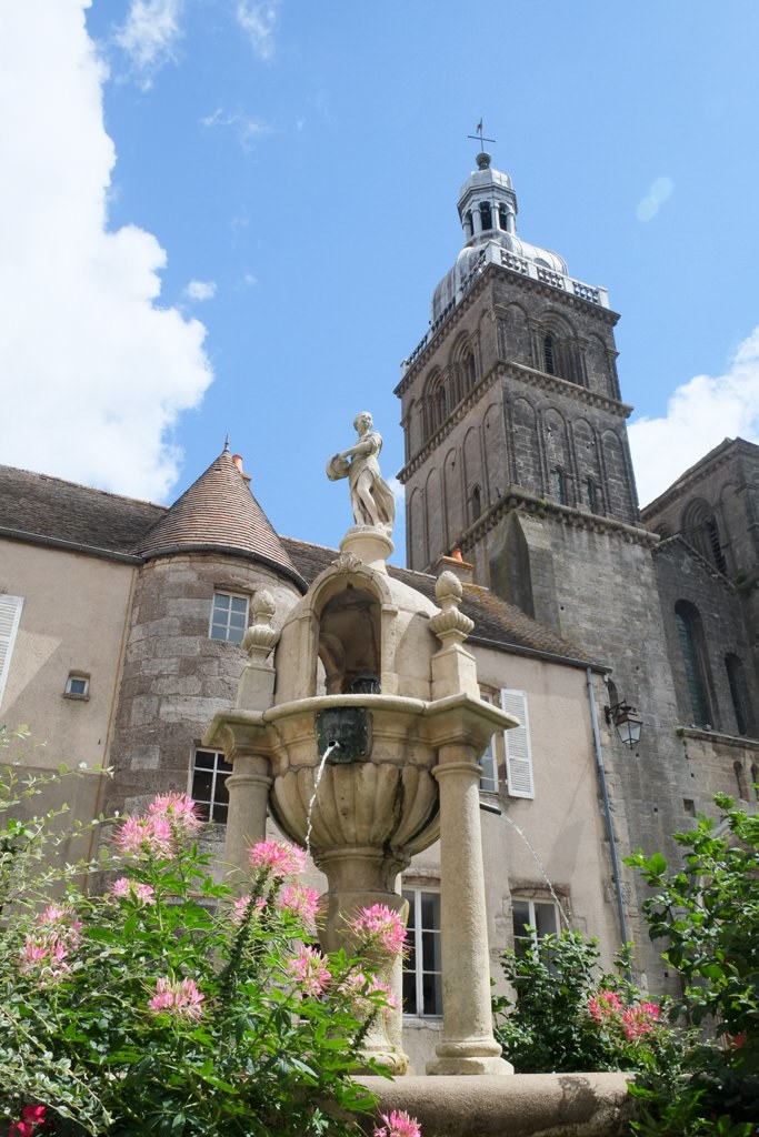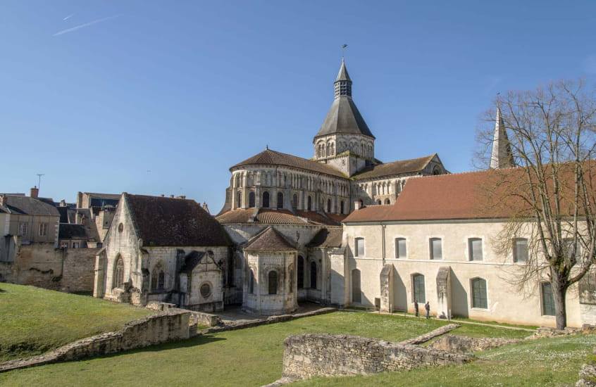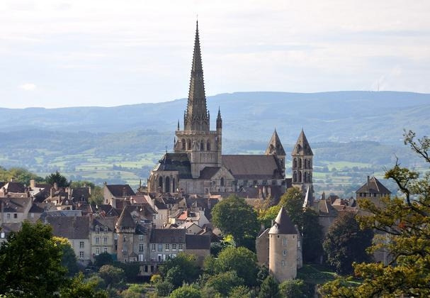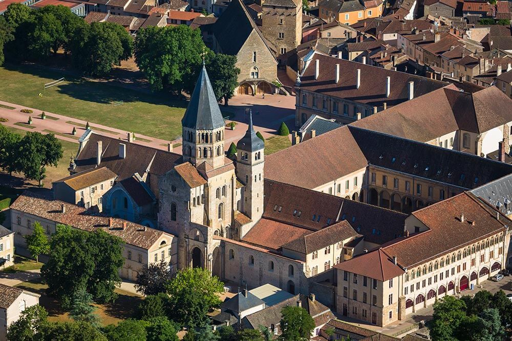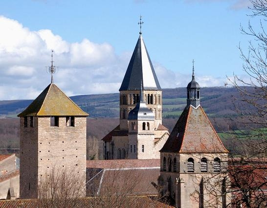 사진상으로 가장 멀리 보이는 유적이 클뤼니 수도원 본래의 유적에 해당합니다. ‘축성된 물(Eau Bénite)’이란 이름을 가진 종탑과 작은 시계탑이 거대한 트란셉트 남쪽 팔에 해당하는 부분 위로 올라섰습니다. 앞쪽 왼쪽에는 치즈 탑(Tour des Fromages)이 서있고 오른편에는 수도원 한 중심에 서있는 옛 탑이 보입니다. 성모 마리아(노트르담) 성당의 종탑입니다.