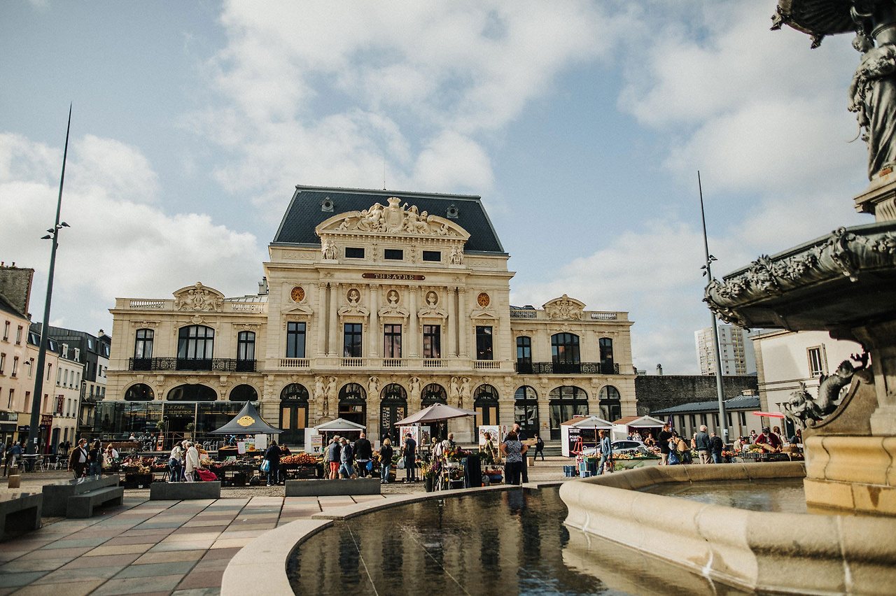 셰르부르 연극 극장 앞 광장, 노르망디 관광청 인터넷 홈페이지 속의 꼬할린과 레오 사진.